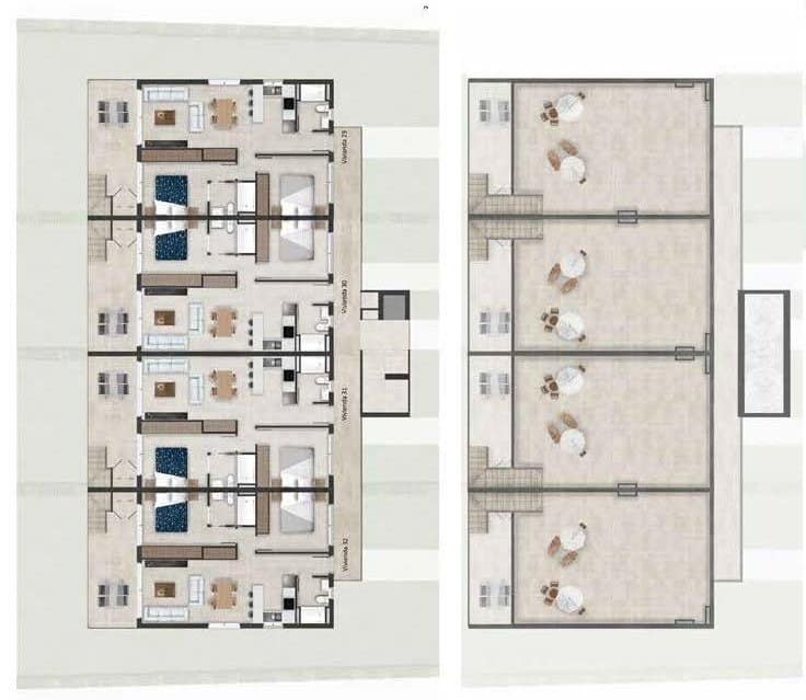 The apartments have an area between 73.88m2 and 75.22m2 divided into 2 bedrooms, 2 bathrooms, an open living-kitchen-dining room of 26.80m2, and a 17m2 terrace.