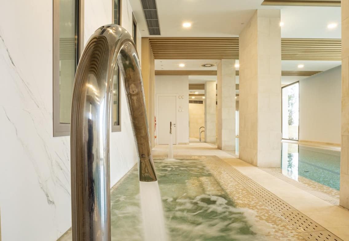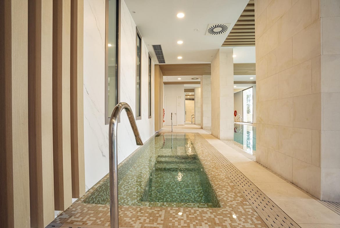 A 25-meter heated indoor pool, sauna, and Jacuzzi in the spa.