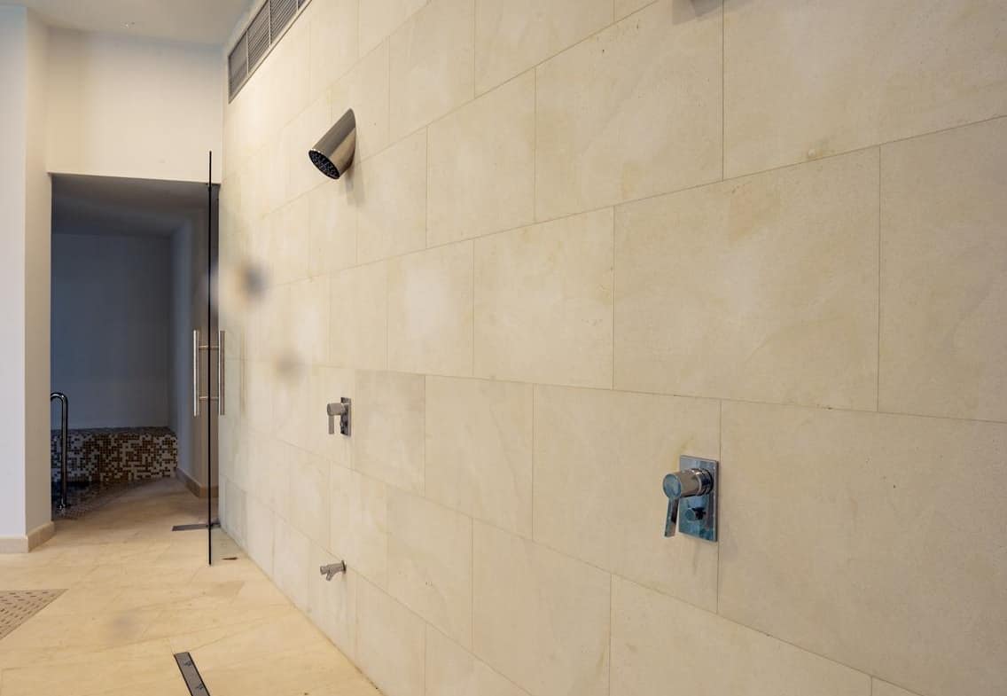 Outdoor saltwater pools, a yoga and meditation area, and an outdoor gym.