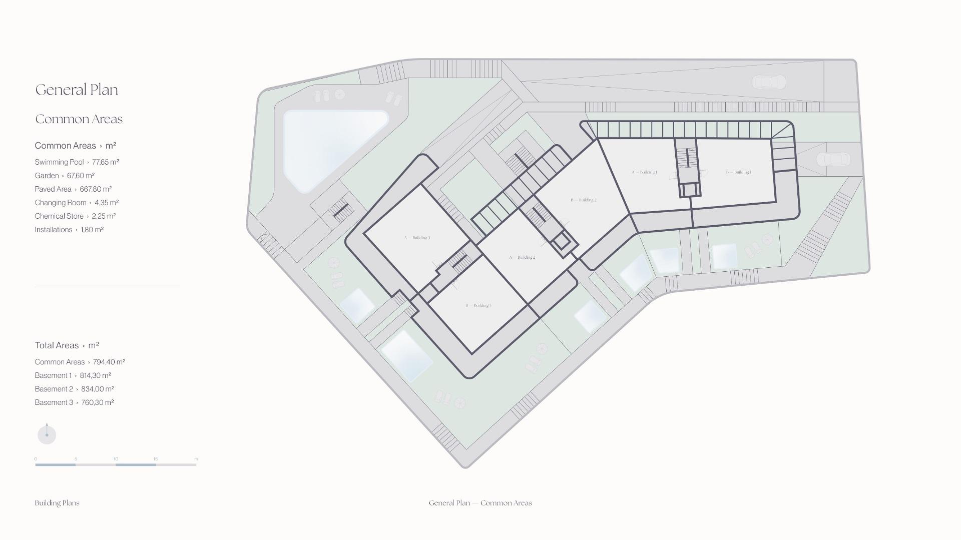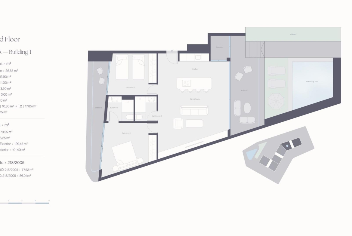 The ground floor homes have a garden and optional private pool, and the penthouses have a solarium and swimming pool on the roof.