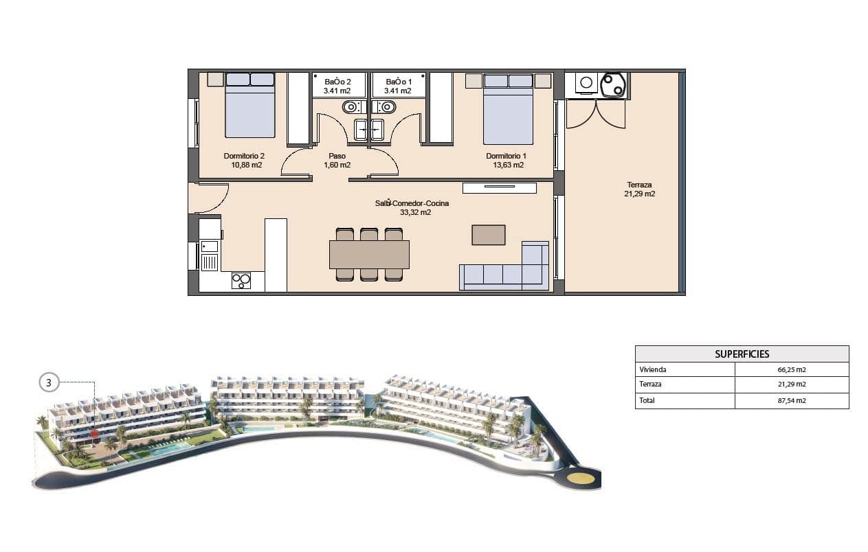 Discover a unique and luxurious new development in Finestrat, Alicante, offering an exclusive lifestyle on the Costa Blanca. This gated residential complex features 99 modern apartments with 2 bedrooms and 2 bathrooms, just 2.3 km from the beaches of Benidorm, with breathtaking views of the Mediterranean Sea and the city skyline.
