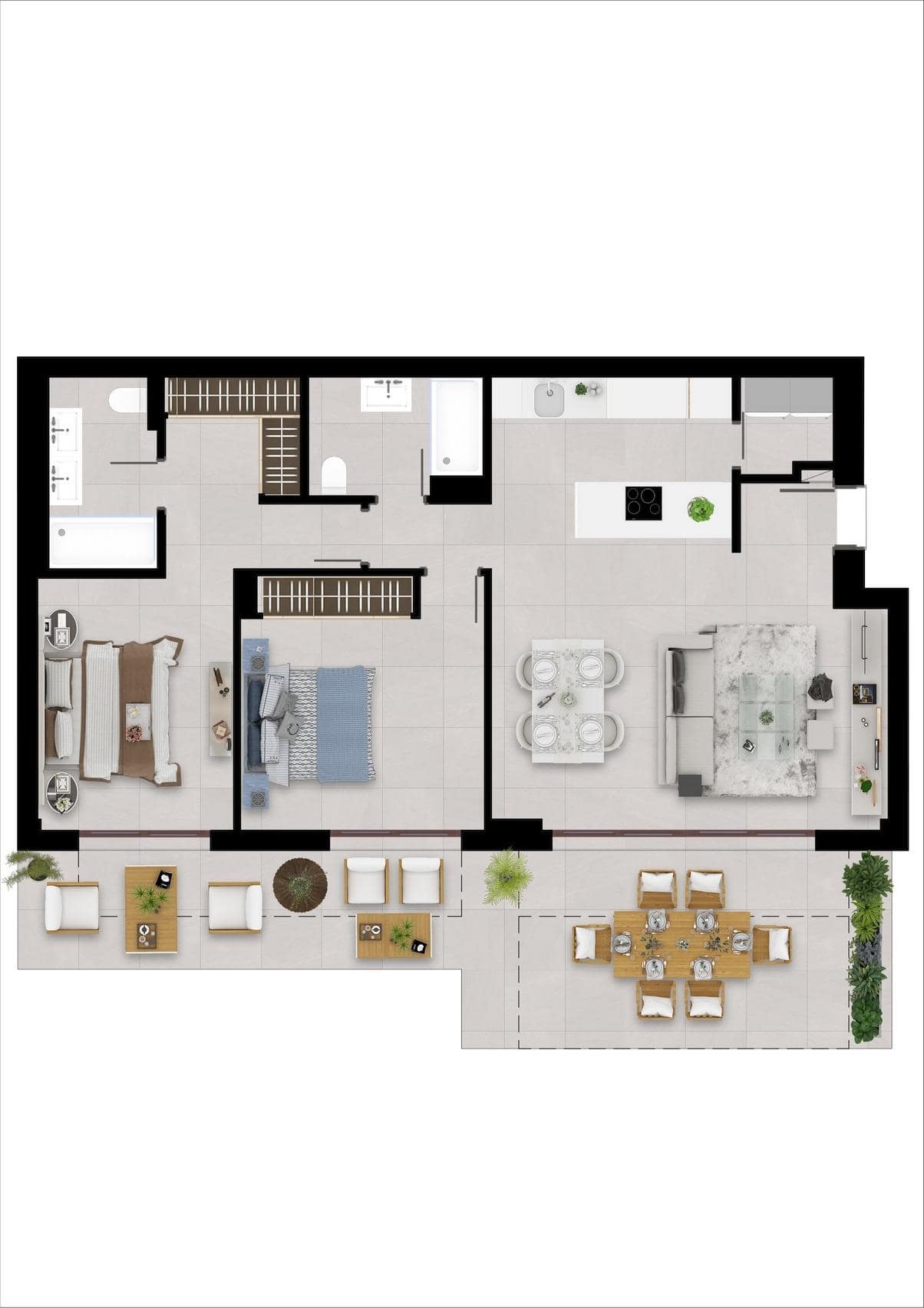 The project includes 4 blocks of 3 floors with homes in contemporary “open plan” style but with a rustic appearance that blends into the natural surroundings. Apartments with 2 and 3 bedrooms and penthouses with a solarium, with large terraces, communal pool and gardens with autochthonous plants.