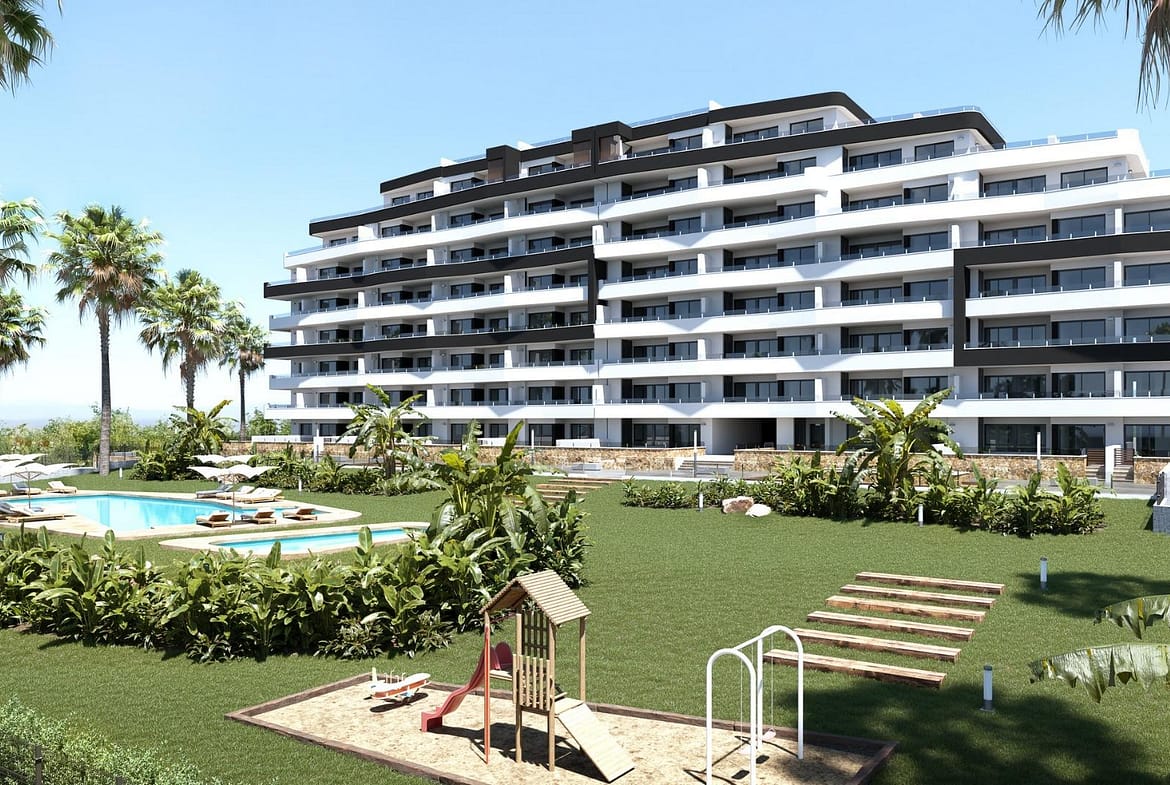 This newly built residential complex in San Miguel de Salinas offers modern 2-bedroom apartments with spacious terraces, carefully distributed over seven floors. The gated community offers first-class facilities, including separate swimming pools for adults and children, lush green areas, a children’s playground and a petanque area.