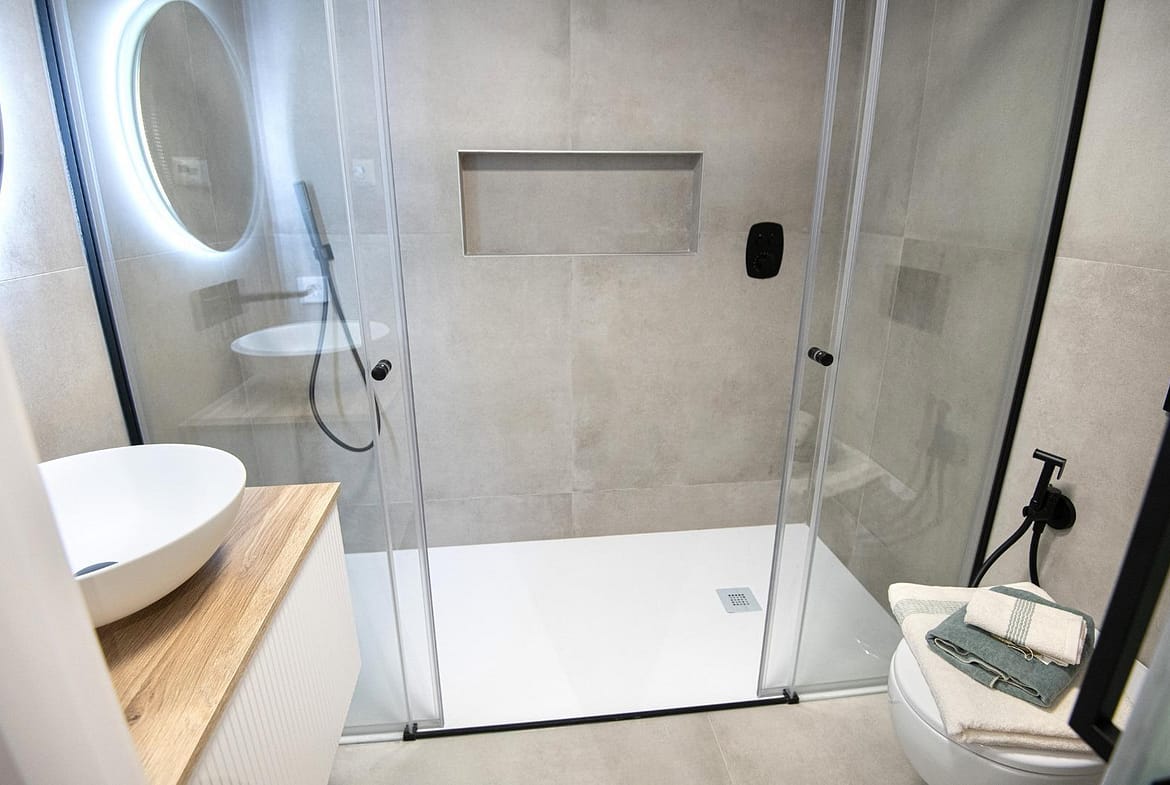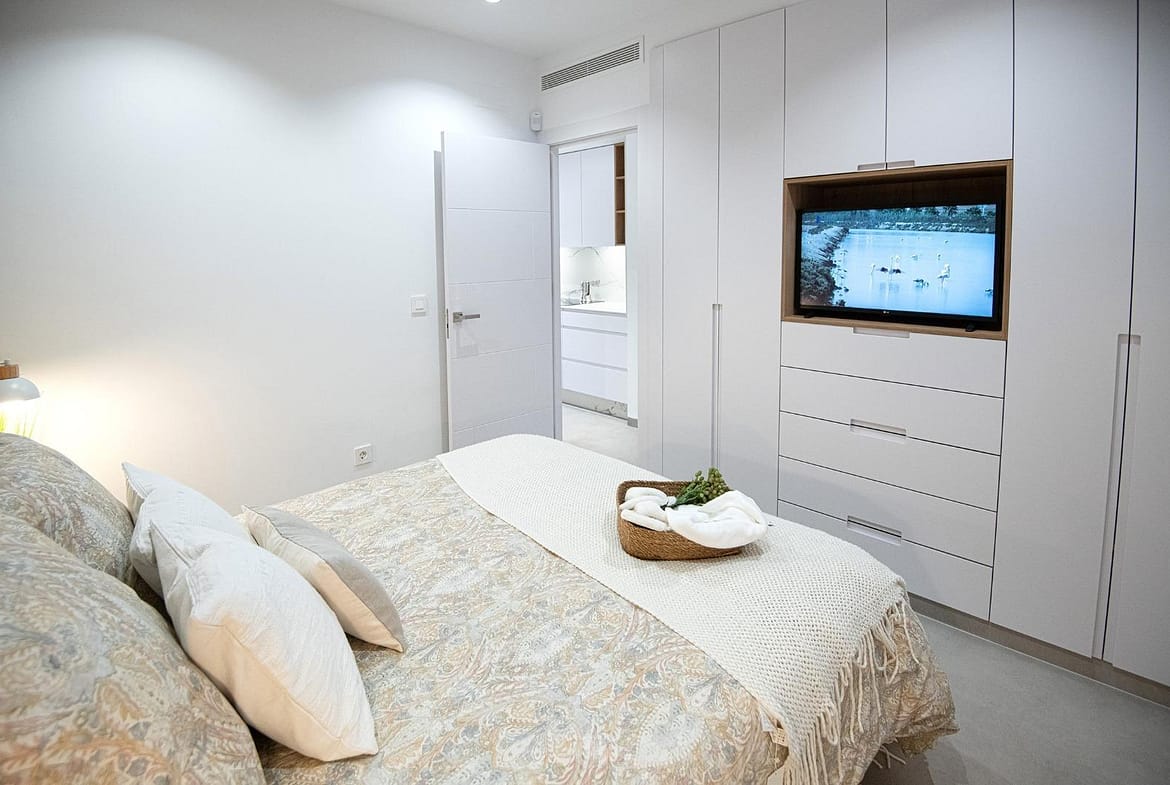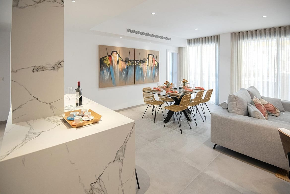 Apartments and penthouses with 2 and 3 bedrooms, 2 bathrooms, with open plan fully equipped kitchen with white goods – Bosch or Siemens, living area, large terraces, fitted wardrobes, fully equipped bathrooms with underfloor heating, aircon, electric shutters, closed storage, parking space with socket 16 Amp for electric cars.