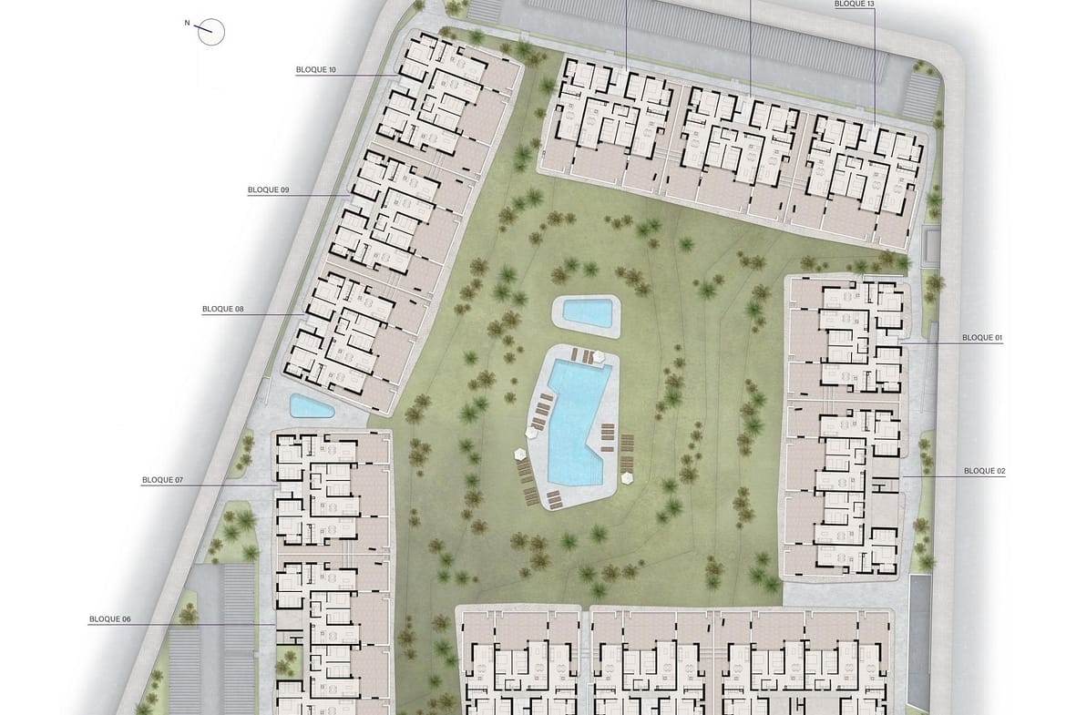 Villas: Independent properties with three bedrooms and three bathrooms, available in one- or two-story layouts. Each villa includes a private pool, a solarium, and parking within the plot. Optional basements are also available.