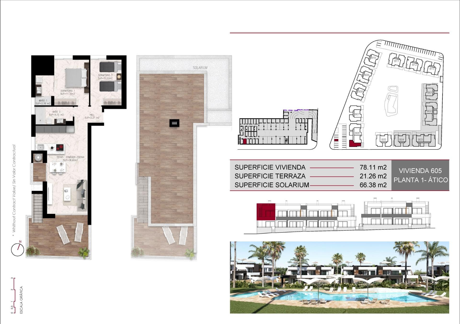 Bungalows: Ground-floor units with private gardens or top-floor options with solariums. All bungalows include two bedrooms, two bathrooms, a parking space, and a storage room, set around a central communal area with a swimming pool and landscaped gardens.