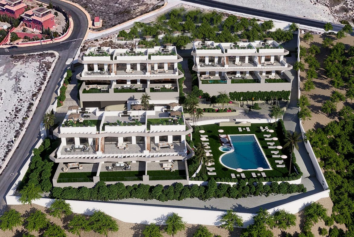 NEW BUILD RESIDENTIAL COMPLEX IN FINESTRAT New Build unique and exclusive high standing residential complex in Balcon de Finestrat. This complex of modern bungalows with 2 and 3 bedrooms, all with 2 bathrooms, open plan kitchen with the living and dining room. Top floor bungalows with private solarium and ground floor bungalows with private garden and possibility of private pool at an extra cost. Properties has loads of natural light and designer island in the kitchen. Lift in all homes. Sustainable construction with energy certificate A. Each property has private parking. Indoor Fitness Gym. Bio-healthy area for sports. Communal swimming pool. Indoor and outdoor LED lighting pack. High quality materials and brands. The properties have access to a large swimming pool and enjoy one of the best locations on the Costa Blanca. It is a great opportunity and privilege to be able to live with this environment of golf and beach, close to all amenities of all services considered one of the best places to invest. Finestrat located in the Marina Baixa region of the Costa Blanca. Benidorm is just a five-minute drive from the properties and offers all the services you would need including shops, bars, restaurants, supermarkets, banks, pharmacies and several private international schools. Close to the beaches of Levante, Poniente and Cala de Finestrat, with more than 6km in length that are among the best in Europe awarded by the European Union with Blue Flags. All leisure services such as the theme parks of Aqua Natura, Terra Mítica, Terra Natura, Aqualandia and Mundomar, Sierra Cortina and Villaitana Golf courses, hiking and climbing in Puig Campana an incomparable natural setting or enjoy of nautical sports. Distance to the sea 4 km, to the airport 26 km and to the golf 1km. Complex located 40 minutes from Alicante airport.