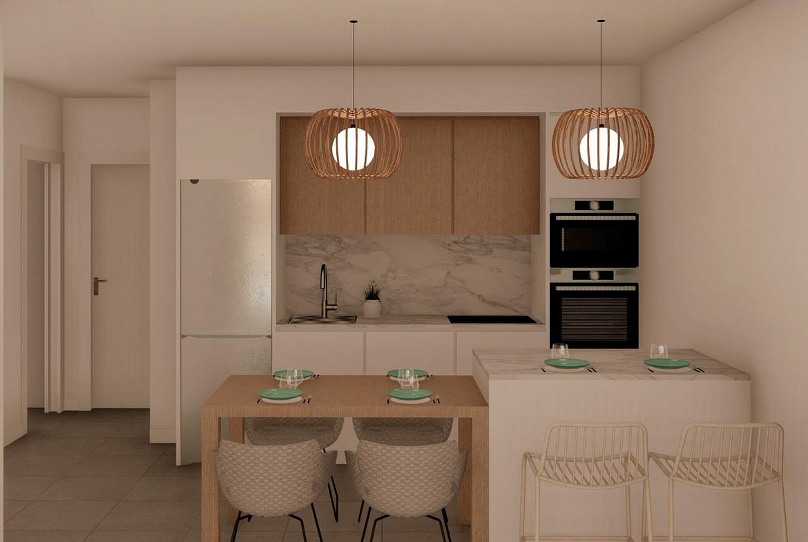 NEW BUILD BUNGALOWS IN ROLDAN New Build gated residential complex of bungalow apartments located in Roldán, Murcia. These exclusive bungalows are designed with 3 bedrooms and 2 bathrooms, terrace on the ground floor and with 2 bedrooms and 2 bathrooms and solarium for the upper floor. The interiors, elegant and functional, have high quality floors, fully fitted kitchens in white combined with imitation wood, including electrical appliances. The bathrooms have a vanity unit with washbasin and light. The bedrooms include lined wardrobes with drawers and sliding doors and each property has pre-installation for ducted air conditioning. The exteriors are not less impressive, including a communal swimming pool and a beautiful sport area and childrens playground on artificial grass to enjoy. Each property has parking space. Storerooms are optional at an extra cost. Roldan itself is a traditional town with all the local amenities you will need including Supermarkets, Restaurants, Bars, Health Clinic, Pharmacy, Police Station, Petrol Station, Mechanics, Dentists, Doctors and more. The nearby golf resorts of La Torre, & Terrazas are easily accessible, Corvera Airport is 15 minutes away & the beaches of the Mar Menor just 20 minutes drive.