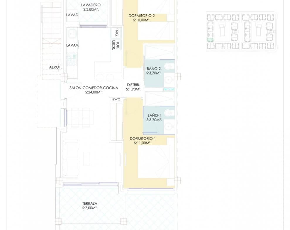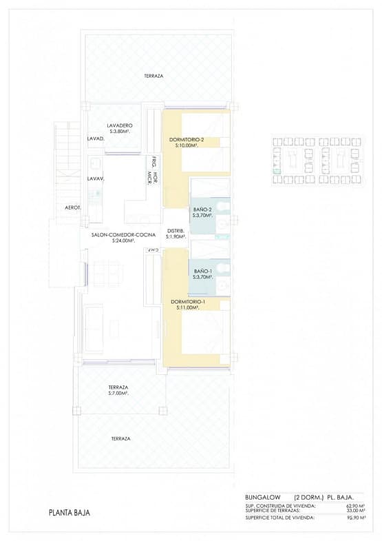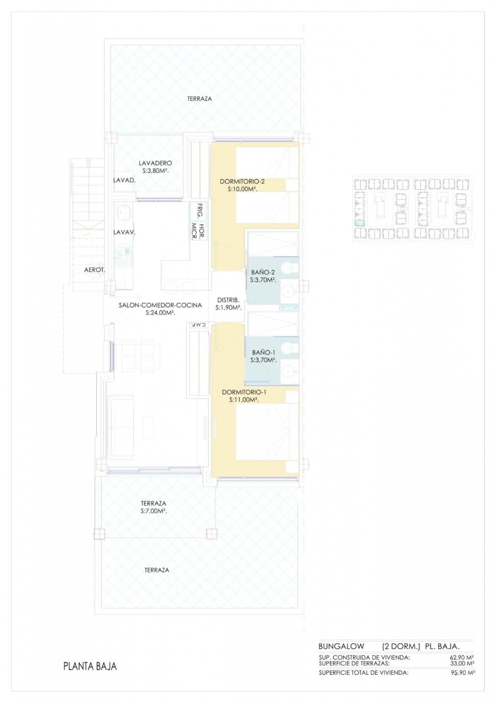 NEW BUILD RESIDENTIAL OF BUNGALOW APARTMENTS IN LOS BALCONES, TORREVIEJA New Build residential complex with magnificent pink salt lake views in Los Balcones. Complex consist of 104 bungalow apartments with 2 and 3 bedrooms, top floor bungalow has private solariums with panoramic views to the salt lake and ground floors bungalows have big terraces overlooking the green area. These bungalows share beautiful green areas and 2 large swimming pools. Optional underground parking and storage spaces are available. This residential offers modern design, selected materials, apartments finished to very highest specification using only top quality materials. The Residential will be built up to a hillside, in this way the view and also the air is clear and unique quality. Los Balcones located just outside Torrevieja with all accessible services, just 5 minutes from Playa de Los Náufragos, supermarkets, the school and the La Zenia Boulevard Shopping Centre, and a minute from Torrevieja University Hospital. Furthermore you will find 4 golf courses within a short drive, including the award winning Las Colinas Golf & Country Club. Complex located 40 minutes from Alicante airport and 1 hour Murcia – Corvera airport.