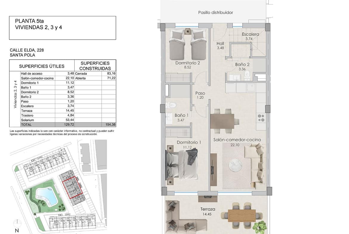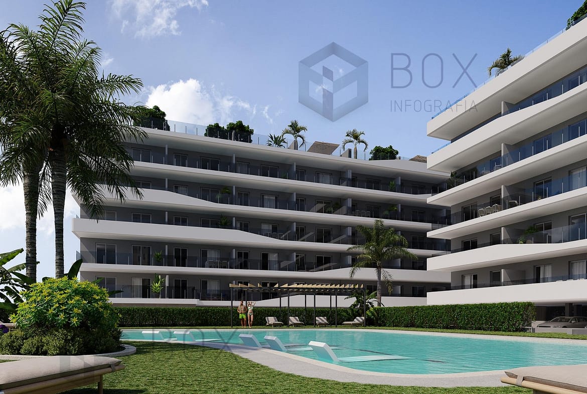 NEW BUILD RESIDENTIAL COMPLEX IN SANTA POLA Modern gated residential complex comprising 3 blocks of apartmwnts with large landscaped communal areas including a swimming pool with water beds, children’s playground, pergola and bicycle parking. The residential has 3 and 2 bedrooms apartments, both types include 2 full bathrooms, open plan kitchen with living room, fitted wardrobes, terrace, parking space. They have a common garden , swimming pool with beach-type entrance, equipped with showers and a large wooden pergola. It has landscaped areas with palm trees and vegetation, all of which are illuminated. In the central part of the pool there is a shallower area where the water beds are located. The municipality of Santa Pola is located on the popular Costa Blanca on the Mediterranean, south of Alicante and in the Bajo Vinalopó region. The city is in an enviable geographical position, surrounded by natural landscapes and with a special microclimate, which offers a mild climate all year round. Its urban center is bounded by the Castle Fortress and the port to the east and west, and is bordered by the Santa Pola Salinas Natural Park and the Sierra and Cabo de Santa Pola, an ancient reef today characterized by its reef leafy pine trees. Santa Pola located 21 km. from Alicante, the provincial capital with excellent infrastructure and 15 km. away from the international Airport “Elche-Alicante”.