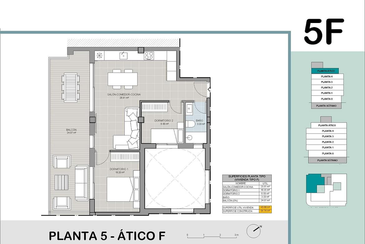 Stylish Residential Building 60 m away from El Acequion Beach at Torrevieja 23 Functional Homes with a selection of 1, 2 and 3 bedroom apartments, and penthouses with large private terraces. Optional parking spaces at underground for additional convenience. Enjoy life just steps from the Mediterranean. Surrounded by everything you need — supermarkets, schools, restaurants, parks, and beach bars — making it the perfect place to live year-round or enjoy as a second home. Each unit is thoughtfully designed to maximize natural light, space, and functionality — with some houses with private terraces or laundry rooms. On the rooftop, residents can enjoy a communal solarium with a relaxing lounge area and a swimming pool, perfect for soaking up the sun and sea breeze all year round. Distances to key points: AcequiĂłn Beach: 60 m Torrevieja town centre: 500 m Marina Salinas marina: 1.5 km Torrevieja University Hospital: 5.5 km VillamartĂ­n golf course: 10 km Habaneras Shopping Centre: 3 km Alicante Airport: 45 km High-end finishes in every home The homes have been built with top-quality materials and contemporary design: Exterior carpentry in aluminium with thermal break and double glazing Motorised blinds at bedrooms. Armoured entrance door Kitchen equipped with wall and base units Hot water produced by aerothermal system Air conditioning pre installation Baths with furnitures, mirrors and fixed glass at showers. Lift in the building Live a stone’s throw from the sea and the town centre Torrevieja is one of the most dynamic and growing coastal towns on the Costa Blanca, famous for its climate, beaches, salt flats and cultural life. This development is ideal as a permanent residence, investment or second home for holidays. Contact us today for more information or to arrange a viewing and secure your home by the sea in Torrevieja.