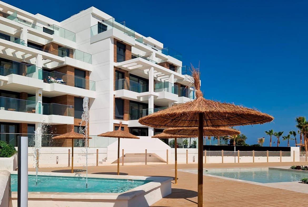 MEDITERRANEAN HOUSING A FEW METERS FROM THE SEA Exclusive complex of Mediterranean construction a few meters from the sea. On the beachfront, in front of L´Estanyo beach (7 km from the town center). Apartments and penthouses with two and three bedrooms, all with sea views. Magnificent common areas with a large garden area and two swimming pools, one for children. In an unbeatable location, in the area known as L´Estanyo that gives its name to its beach, with calm waters, an extensive area of ​​golden sand surrounded by all facilities and services, as well as leisure and restaurant venues.