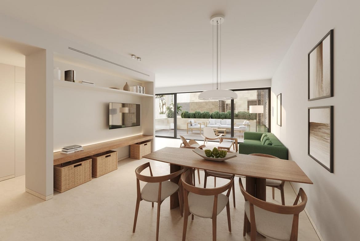 Standard and Premium interiors are thoughtfully designed by our architects. Al apartments come fully furnished with heated floors in all spaces, Schneider light switches, smart locks and basic climate automation, as well as water-saving bathrooms and kitchens, and connections to the weather station. Swedish appliances from Asko Kitchen: stovetops, ovens and hoods, dishwashers, refrigerators. Laundry: washing machine and drying machine. German bath fixtures from Villeroy &Boch, Sliding doors unite the terraces and living rooms as one space, harmonising indoor-outdoor living, and each unit is designed with moveable walls to adapt to how families evolve. Wooden folding screens offer shade while enabling air circulation. Standard: light coloured furniture. Premium: wooden furniture with dark varnish, stone surfaces.