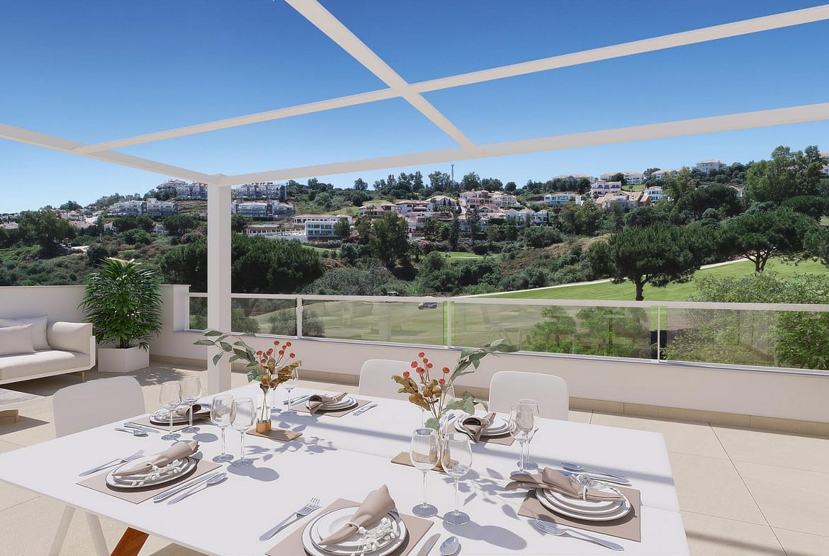NEW BUILD RESIDENTIAL COMPLEX AT LA CALA GOLF RESORT, MIJAS New Build residential complex of apartments and penthouses at the La Cala Golf Resort. The residence is being built at the top of the hill overlooking the Europa Golf Course, in a fabulous position that provides panoramic views of the golf course and some of them to the sea. All the properties are south or southeast facing, meaning that they enjoy plenty of light all day long. Residential complex located near to the Club House and the Hotel & Spa, where owners of the properties in the Resort can take advantage of the benefits and discounts provided by the Privilege Card. Ideal for families looking for a holiday home or investors looking for a property to rent out for the summer season with a good return. The project is split over two independent plots with 105 and 90 apartments, integrated into a common architectural concept. The first line golf apartments are near the hotel, the Clubhouse and the sport area and SPA. All properties have large terraces with glass balcony enclosures so that you can fully enjoy the fabulous views of the golf course and the apartments on the ground floor also have private gardens with views of the pool, resort gardens and the golf course that surrounds the development. Properties have a modern distribution with the “total living” concept where all the space is utilised, and with a large living room integrating the terrace via the large windows. The homes are fully equipped, with fitted wardrobes, air conditioning, fitted kitchen with appliances, LED lighting package and fully fitted bathrooms with unit, mirror and shower screen. There is also an extras package available to personalise your home. The residential is gated and has different parking options: outdoor and indoor. There is also an adult pool, infant splash pool and communal gardens overlooking the valley. La Cala Golf Resort. Only 10 min drive inland from the Mediterranean coastline between Malaga and Marbella, at the foot of the Mijas mountains, with its typical Spanish white village Mijas Pueblo. The Luxury Hotel is build in Andalusian style with 3 top restaurants carefully managed by top chef Daniel García Peinado. Great selection of activities: Football, Tennis, Squash, Fitness, indoor and outdoor pools. La Cala Spa offers all a wide selection of wellness treatments. Just a few minutes away by car you have the charming town of Mijas and its carefully preserved old town with quaint narrow streets, you can go shopping in Marbella or Fuengirola, or enjoy the nightlife in La Cala de Mijas or Puerto Banús.