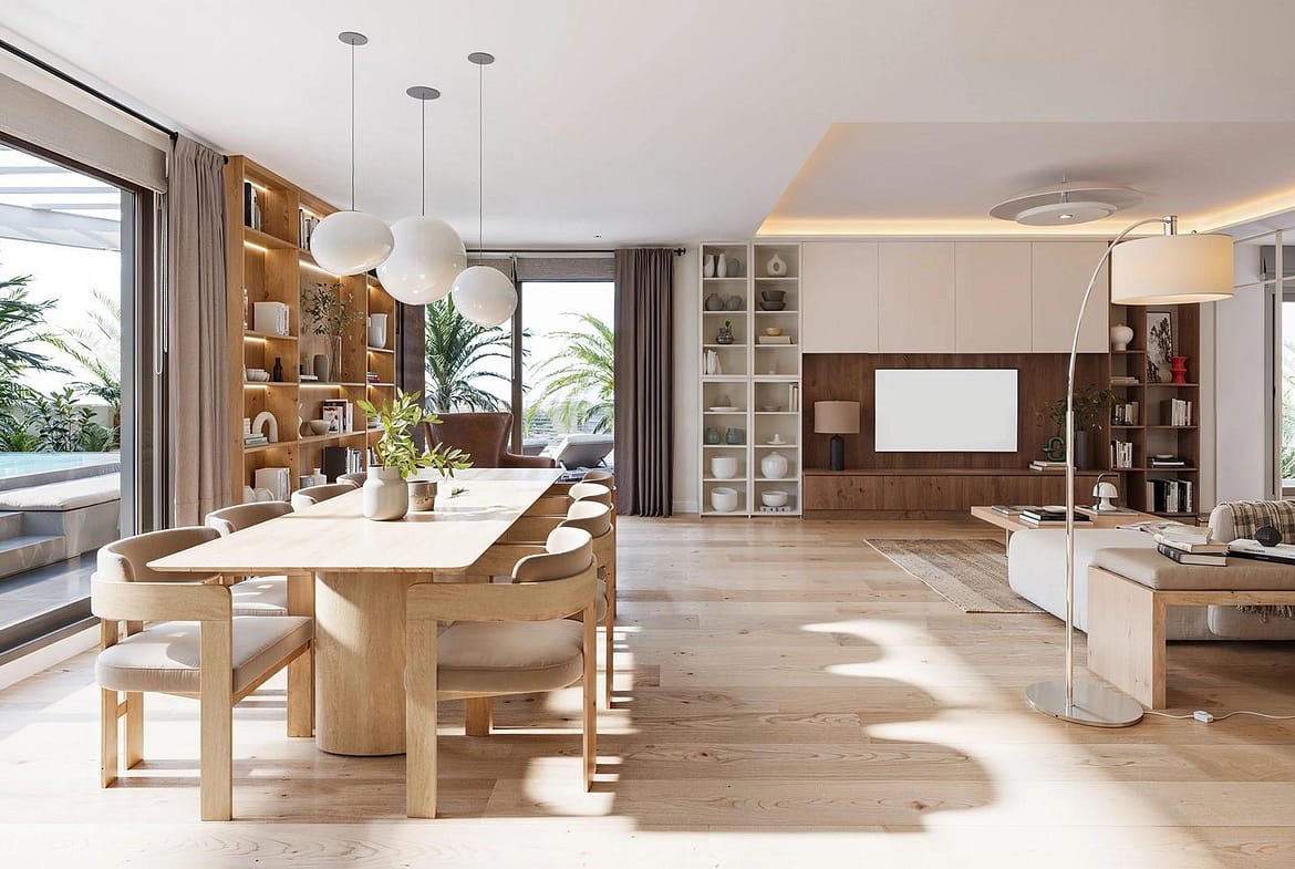 Large-format porcelain floors with a wood finish, providing continuity and warmth.