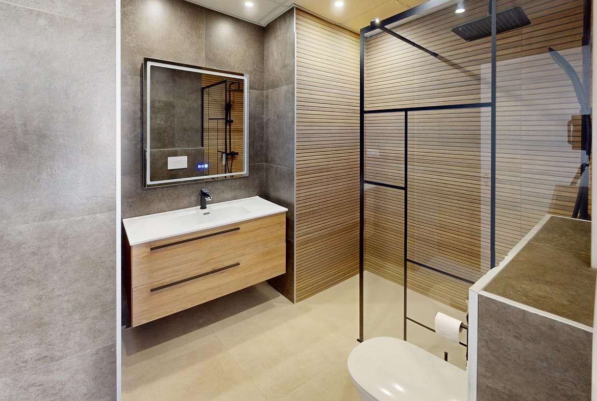 Fully equipped bathrooms with vanity units, mirrors, and shower screens
