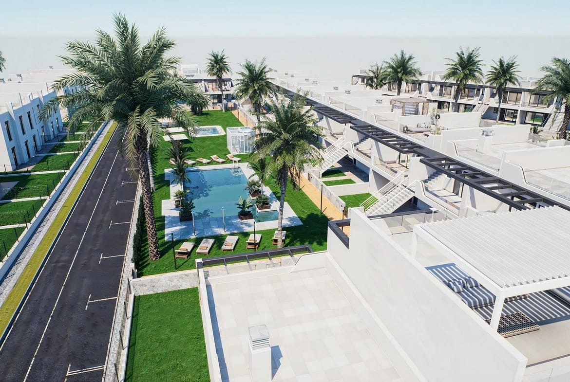 New Build Bungalows with Garden or Solarium Near the Beach in Pilar de la Horadada Modern Mediterranean Homes Designed for Comfort Discover this exclusive new build residential complex in Pilar de la Horadada, offering contemporary bungalows located less than 2 km from the beach. Designed to combine comfort, style and functionality, these homes are ideal for year round living, holidays or as a smart investment on the Costa Blanca. The development offers a choice between ground floor bungalows with private gardens and top floor bungalows with private rooftop solariums. Each property is thoughtfully designed to maximize outdoor living and make the most of the Mediterranean climate. Spacious 2 Bedroom Properties with High Quality Finishes Each bungalow features 2 bedrooms and 2 bathrooms, one of them ensuite, along with a private parking space in the underground garage. The homes are built with quality materials and modern finishes that ensure energy efficiency and durability. Key features include: Preinstallation for ducted air conditioning Aluminium exterior carpentry with double glazing and motorized shutters Security entrance door for peace of mind Aerothermal system for efficient hot water production Built in wardrobes in all bedrooms Fully equipped bathrooms with furniture and shower screens These specifications provide a comfortable and practical home suitable for all seasons. Private Community with Pool and Landscaped Gardens The residential complex is private and secure, with beautifully landscaped communal gardens and a large communal swimming pool. This creates a pleasant and relaxing environment where residents can unwind and enjoy the excellent climate. Located just outside the town center, the development allows residents to walk to supermarkets, restaurants, bars, schools and essential services without needing a car. Excellent Location Close to Beaches and Services Pilar de la Horadada is a charming Spanish town in the southernmost part of the Costa Blanca, known for its lively atmosphere, local shops, traditional squares and friendly community. The sandy beaches of Torre de la Horadada Beach and Mil Palmeras Beach are just 2 km away, offering fine golden sand, a scenic promenade and a marina. The area is also ideal for cycling, walking and outdoor sports. Distances to Key Points of Interest Lo Romero Golf 5 km La Zenia Boulevard 15 km Murcia Corvera Airport 40 km Alicante Airport 55 km Torre de la Horadada Marina 3 km Reserve Your New Home Today Do not miss this opportunity to own a brand new bungalow near the beach in one of the most desirable areas of the Costa Blanca. Contact us today for more information and to arrange a visit.