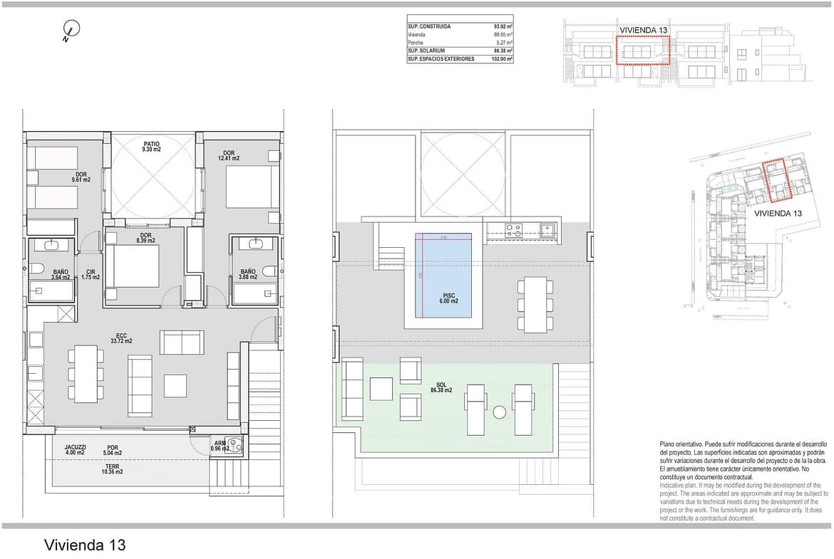 New Build Bungalows for Sale in Pilar de la Horadada 3 km from Beach Boutique Residential Development in Pilar de la Horadada Discover this exclusive new build residential complex of modern bungalows located in Pilar de la Horadada, the southernmost town of the Costa Blanca. This boutique project consists of only 14 carefully designed homes with 2 or 3 bedrooms and 2 bathrooms, offering an ideal combination of comfort, style and Mediterranean lifestyle. The development is situated in a quiet residential area within walking distance of the town center, allowing residents to enjoy easy access to shops, restaurants, supermarkets and essential services. Pilar de la Horadada is known for its welcoming atmosphere, traditional Spanish charm and lively main street filled with cafes, boutiques and charming squares. Modern Bungalows with Private Outdoor Spaces The homes have been designed to offer bright interiors and functional layouts, perfect for both permanent living and holiday use. Ground floor bungalows feature a private garden and private swimming pool, creating the perfect setting to enjoy outdoor living, sunbathing or entertaining family and friends. Top floor bungalows include a spacious terrace and a private rooftop solarium. The solarium comes with a summer kitchen and offers the option to add a private pool or jacuzzi at an extra cost, making it an ideal space to relax while enjoying the warm Mediterranean climate and open views. Each property includes a private parking space within the residential complex for added convenience. Quality Construction and Modern Features These new build homes are built with quality materials and modern installations designed to ensure comfort and energy efficiency throughout the year. Aluminum exterior carpentry with thermal break Fully fitted kitchens with included appliances Bathrooms equipped with mirrors and shower screens Interior and exterior LED lighting Hot water system with energy efficient aerothermal technology Pre installation for ducted air conditioning The combination of modern design and practical features makes these homes an excellent option for buyers looking for a contemporary property on the Costa Blanca. Excellent Location Close to Beaches and Golf Pilar de la Horadada enjoys a strategic location close to some of the best beaches and golf courses in the region. Torre de la Horadada beach 3 km Mil Palmeras beach 3 km Lo Romero Golf 6 km Region de Murcia International Airport 45 km Alicante Elche Airport 75 km The area also offers excellent road connections to nearby coastal towns, marinas and leisure facilities, making it a perfect base to explore the Costa Blanca and Costa Calida. Find Your New Home on the Costa Blanca If you are looking for a modern new build bungalow near the beach with excellent amenities and a fantastic location, this residential development in Pilar de la Horadada is an outstanding opportunity. Contact us today for more information or to schedule a visit.
