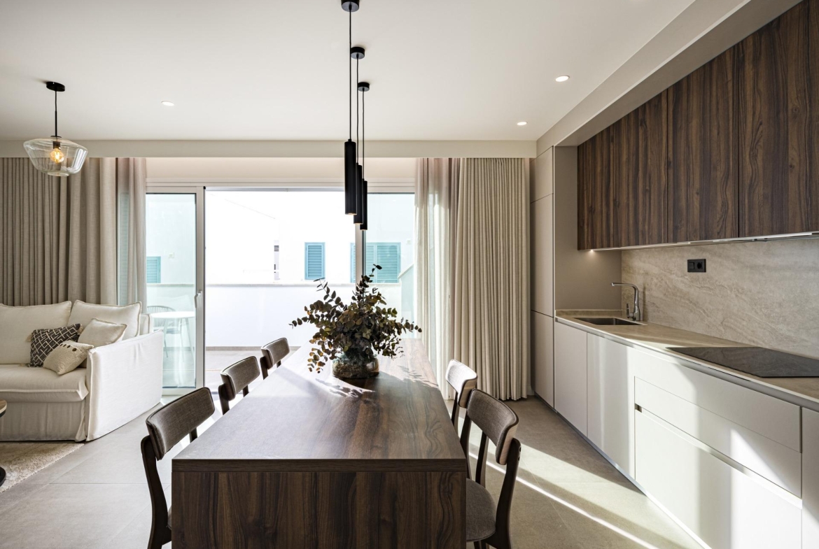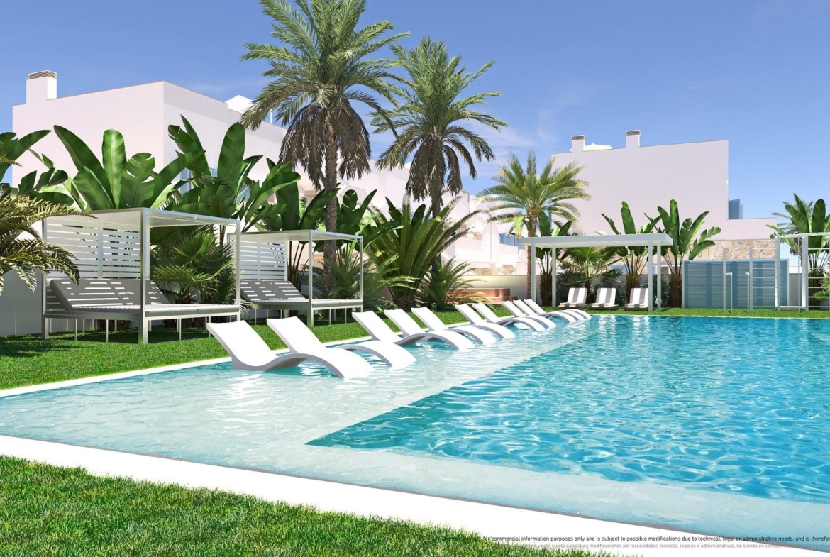 NEW BUILD RESIDENTIAL COMPLEX IN TORRE DE LA HORADADA New Build residential complex of bungalow apartments with communal pool in Torre de la Horadada located 800m from the beach. All properties has 3 bedrooms, 2 bathrooms, open plan kitchen with the lounge area, fitted wardrobes and terrace. All properties has private gardens and parking space. Plus bungalows on the top floor has private solarium. Torre de la Horadada is located south of Alicante in a beautiful location on the coast. The beautiful beaches of Torre de la Horadada and Mil Palmeras have fine sand beautiful promenade. There are lots of restaurants, bars and shops, also water sports, diving and snorkelling. It is well connected just 40 minutes from Alicante and Murcias Corvera airports, with large commercial shopping centres and multiple golf courses all within easy reach.