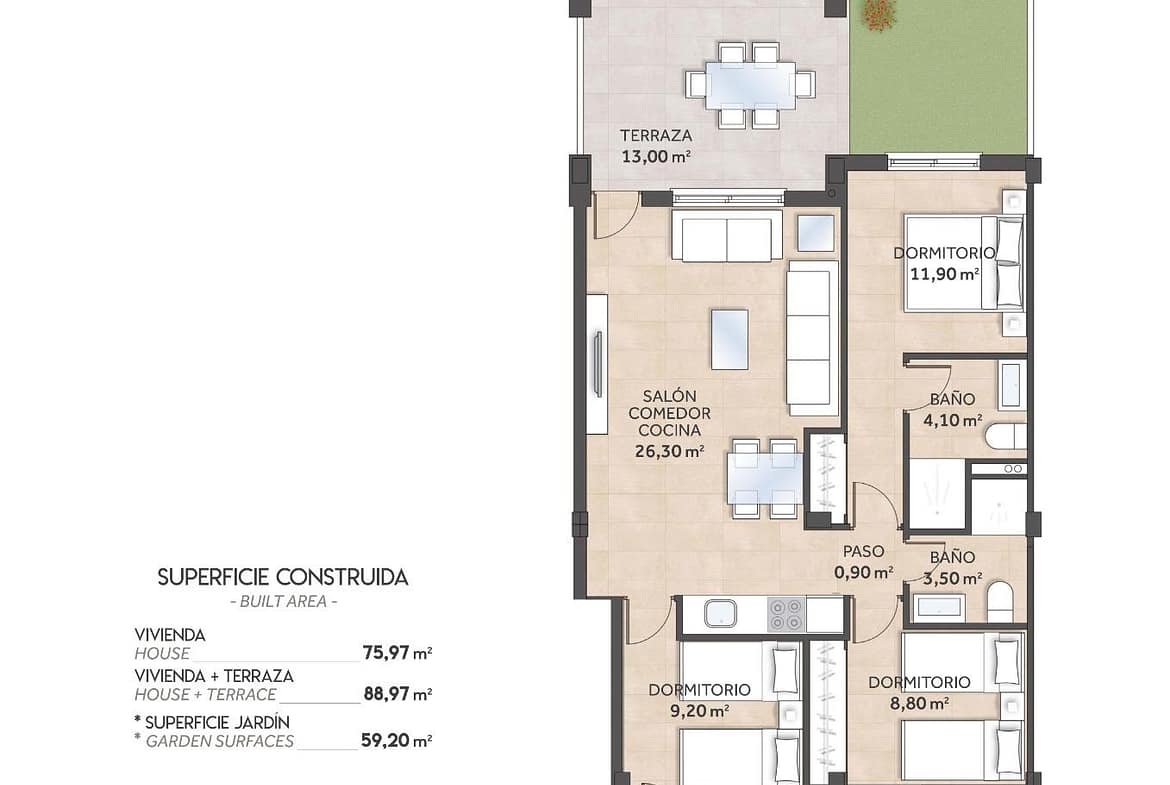 New Build Bungalows in San Miguel de Salinas – Nature, Golf and Comfort Discover this new residential development in San Miguel de Salinas, located in the sought-after area of “La Cañada”, surrounded by a protected pine forest between the prestigious golf courses of Campoamor and Las Colinas. Just 7 km from the Mediterranean coast, this residential offers the perfect blend of tranquility, nature, and easy access to all amenities. Spacious and Modern Homes The development offers two property types to suit different lifestyles: Ground floor bungalows: 2 bedrooms, 2 bathrooms, two large private gardens, and surface parking. Top floor bungalows: 2 bedrooms, 2 bathrooms, spacious solarium with sea views, and surface parking. Each home features generous dimensions and can be adapted into a 3-bedroom layout (optional at an extra cost), with kitchen appliances included. High-Quality Finishes Designed for comfort and functionality, all properties include: Fully equipped bathrooms with furniture, mirrors, and shower screens Aerothermal hot water system Built-in LED ceiling lights Exclusive Community Areas The residential features over 1,700 m2 of landscaped green areas with palm trees and Mediterranean plants. Residents can enjoy a large swimming pool with jacuzzi, a children’s pool, and sunbathing areas, making it the ideal setting to enjoy the Costa Blanca climate all year round. Privileged Location in San Miguel de Salinas This quiet residential is located less than 3 km from the charming town of San Miguel de Salinas, with all daily services at hand. In addition, beautiful sandy beaches in Orihuela Costa and Torrevieja are only 7 km away, offering endless leisure, shopping, and dining options. Close to Renowned Golf Courses For golf enthusiasts, the location is unbeatable. Within a 4 km radius you will find three of the most prestigious golf courses on the Costa Blanca: Villamartín Golf – 3.5 km Las Colinas Golf & Country Club – 4 km Campoamor Golf – 4 km Excellent Connectivity Key points of interest nearby include: San Miguel de Salinas – 3 km La Zenia Boulevard Shopping Centre – 10 km Alicante Airport – 55 km Murcia Airport (Corvera) – 50 km Secure Your New Home in San Miguel de Salinas Whether you are looking for a permanent residence, a holiday retreat, or an investment opportunity, these new build bungalows offer excellent value in one of the most desirable areas of the Costa Blanca. Contact us today for more information and to arrange a visit.