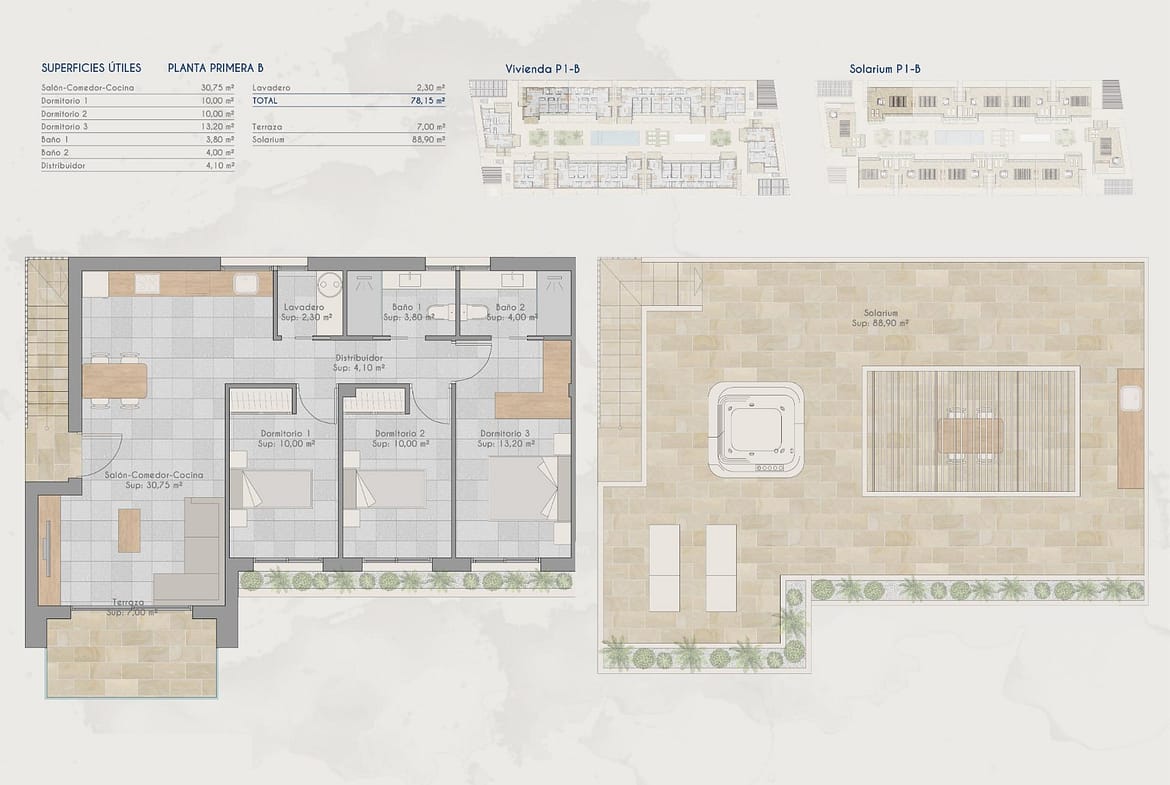 Discover a new residential complex in Torre-Pacheco, offering 24 stylish bungalows with 2 or 3 bedrooms. Choose between ground-floor homes with spacious terraces or first-floor units boasting private terraces and solariums. Each solarium includes a pergola, a barbecue area, and reinforced roofing, perfect for installing a jacuzzi. All homes come with a designated parking space and fully installed air conditioning, ensuring comfort year-round.