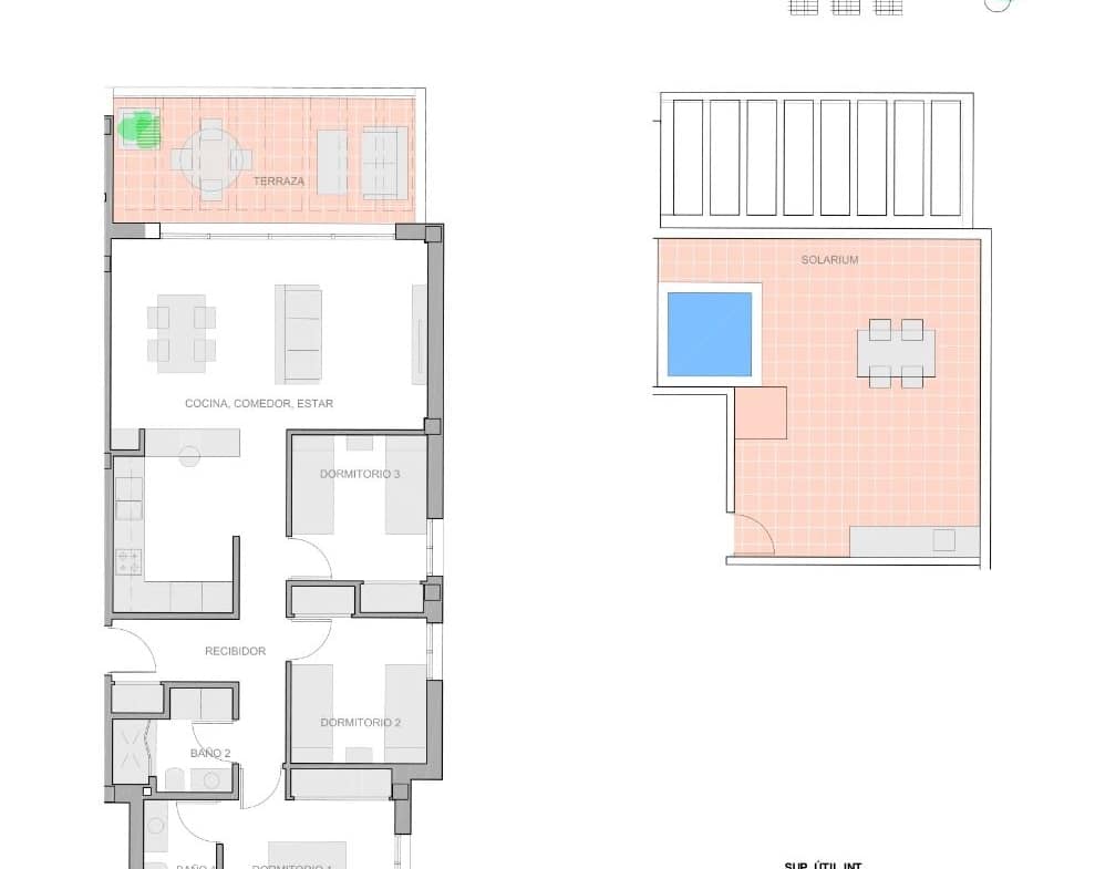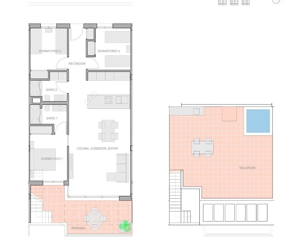 This apartments have 3 bedrooms, 2 bathrooms, open plan salon with kitchen, ground floor with private garden, middle floor with terrace and top floor with private solarium.