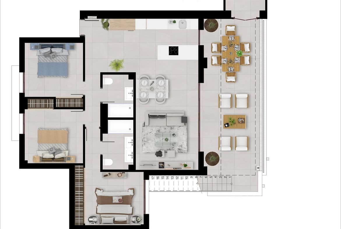 The project includes 4 blocks of 3 floors with homes in contemporary “open plan” style but with a rustic appearance that blends into the natural surroundings. Apartments with 2 and 3 bedrooms and penthouses with a solarium, with large terraces, communal pool and gardens with autochthonous plants.