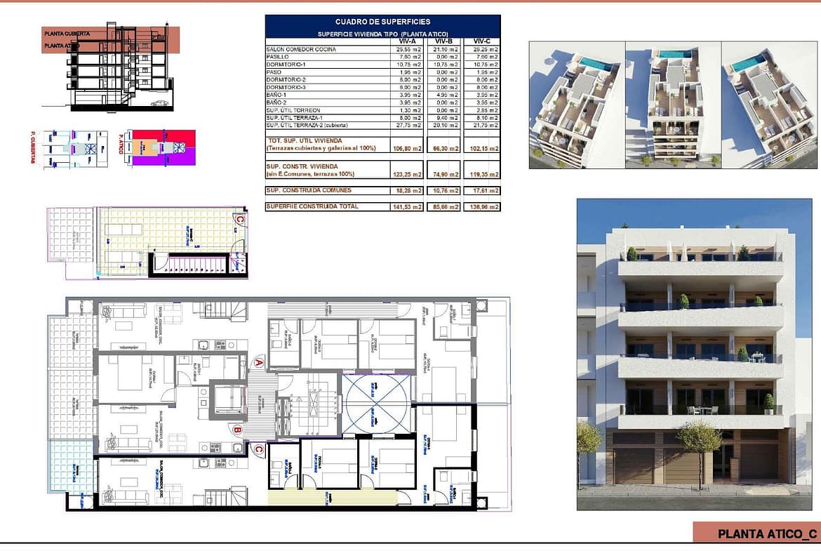 Newly built apartments in Torrevieja Just 600 metres from Playa del Cura beach Prime location in the heart of Torrevieja Discover these brand new apartments and penthouses in one of the most sought-after areas of Torrevieja, just 600 metres from Playa del Cura beach and 300 metres from the seafront promenade. Located in the city centre, this lively neighbourhood offers all essential amenities within walking distance, including supermarkets, shops, restaurants, cafés and public transport. Torrevieja is a well-known coastal town on the Costa Blanca, famous for its mild Mediterranean climate, lively atmosphere and year-round seaside lifestyle. Modern apartments with spacious layouts This exclusive new development consists of only 12 one- and three-bedroom apartments and penthouses, designed for comfort, functionality and contemporary style. The apartments on the middle floors feature spacious terraces, while the penthouses enjoy an additional private solarium, ideal for sunbathing or al fresco dining. All homes include an open-plan kitchen connected to the living-dining room, creating bright and welcoming interiors. The bedrooms have fitted wardrobes and the bathrooms are fully equipped with furniture, mirrors and shower screens. Optional parking spaces are available at an additional cost. Quality finishes and energy-efficient features The flats are built with high-quality materials and a strong focus on energy efficiency. The aluminium exterior joinery includes thermal break technology and double glazing for thermal and acoustic insulation. Motorised shutters add convenience and security. Each home has pre-installation for ducted air conditioning and heating, reinforced entrance doors and white lacquered interior doors. Hot water is produced by an aerothermal system, reducing energy consumption and improving sustainability. Roof terrace solarium with communal swimming pool Residents can enjoy an exclusive roof terrace solarium with communal swimming pool, accessible by lift or stairs. This private area is perfect for relaxing, sunbathing and enjoying panoramic views of the city. It offers a peaceful retreat above the bustling streets of Torrevieja and adds significant value to the development. Lifestyle and surroundings of Torrevieja Torrevieja is known for its extensive coastline, sandy beaches and iconic salt flats. The Lagunas de La Mata y Torrevieja Natural Park is located about 5 km away and offers hiking trails and unique landscapes. Several golf courses, such as Villamartin Golf and Las Colinas Golf, are between 12 and 18 km away. The marina and port of Torrevieja are approximately 1 km away. Alicante Airport is about 45 km away and Murcia International Airport is about 65 km away, both with excellent European connections. Your home on the coast awaits Don’t miss this opportunity to purchase a modern, newly built apartment near the beach in Torrevieja. Contact us today for more information or to arrange a private viewing.