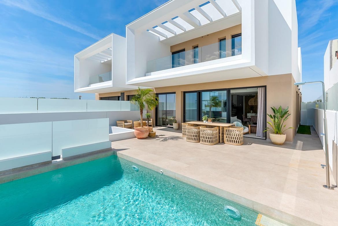 New Build Semi-Detached and Terraced Villas in Dolores, Alicante Discover this exclusive new development of 20 modern semi-detached and terraced villas in Dolores, a charming town located in the heart of the Vega Baja region, in the province of Alicante. Surrounded by orchards and natural beauty, Dolores offers a peaceful lifestyle just a short drive from the Mediterranean coast. Contemporary Villas with Private Pools Each home in this new development is thoughtfully designed over two floors and features: 3 spacious bedrooms 2 full bathrooms and 1 guest toilet Open-plan kitchen with island, furnished and equipped with appliances Bright living-dining area with direct access to the terrace Private garden with swimming pool, filtration system, and LED lighting On-site parking within the plot These villas combine functionality and style, offering everything needed for modern Mediterranean living. High-Efficiency Features and Modern Comforts Built to the highest standards, the homes include: Ducted air conditioning installation on both floors 250-liter aerothermal water heating system Electric underfloor heating in bathrooms Motorized blinds LED lighting throughout the interior and exterior 3kW photovoltaic solar panels for improved energy efficiency These features ensure a sustainable and comfortable home environment year-round. Ideal Location Near the Coast and Amenities Dolores is a well-connected and growing town just 12 km from the stunning beaches of La Marina and Guardamar del Segura. The area offers essential services including shops, restaurants, schools, and health centers. It also maintains a tranquil, residential atmosphere ideal for families and retirees. Distances to main points of interest: La Marina Beach – 12 km Guardamar del Segura – 14 km Alicante Airport – 30 km Murcia-Corvera Airport – 85 km La Marquesa Golf (Ciudad Quesada) – 13 km Torrevieja – 25 km Your New Home Awaits in Dolores Whether you’re looking for a permanent residence, a holiday retreat, or an investment in the Costa Blanca, these new villas in Dolores are a perfect choice. Contact us today for more information or to schedule a viewing.