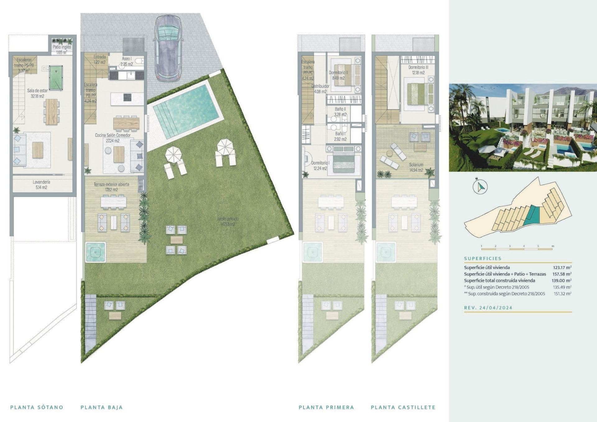 Exclusive townhouses with 3 bedrooms, 2 bathrooms, guest toilet, with a distribution on two floors, plus basement and viewpoint room on the private solarium, spacious rooms, double height living room, panoramic views in the master bedroom, own terrace and a complete equipment with fitted kitchen, air conditioning, heating and double glazing system, among others, with great delicacy in the completion of the details, covering the needs of the most demanding customer.