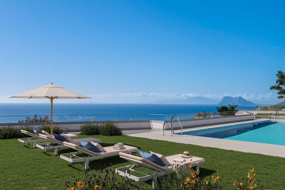 NEW BUILD TOWNHOUSES WITH THE SEA VIEWS IN MANILVA Beautiful New Build residential of townhouses with 3 and 4 bedrooms in Manilva with spectacular views of the sea. Fully equipped kitchens. Installation of A / C and Aerothermal. 1 parking space included in the price. Infinity pool and Club house with Spa and Gym. Next to the best golf course in Europe. All kinds of services nearby. Just 20 minutes from Gibraltar airport. 5 minutes from Sotogrande and 20 from Marbella. Surrounded by golf courses and marinas. Manilva is a coastal city in the province of Malaga on its border with the province of Cádiz in the autonomous community of Andalusia in Spain. Manilva is a very touristic city, especially in summer due to its good climate and atmosphere. It is ideal destination for tourists seeking rest and tranquillity surrounded by the sea. Villas located 1hour 10 minutes drive from Malaga airport.