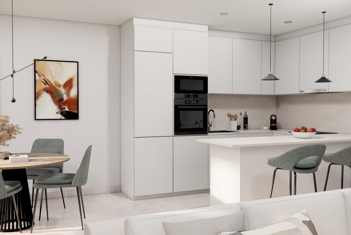 Properties has 3 bedrooms, 2 bathrooms, guest toilet, open plan kitchen with living area and direct access to the terrace, private garden with the parking space.