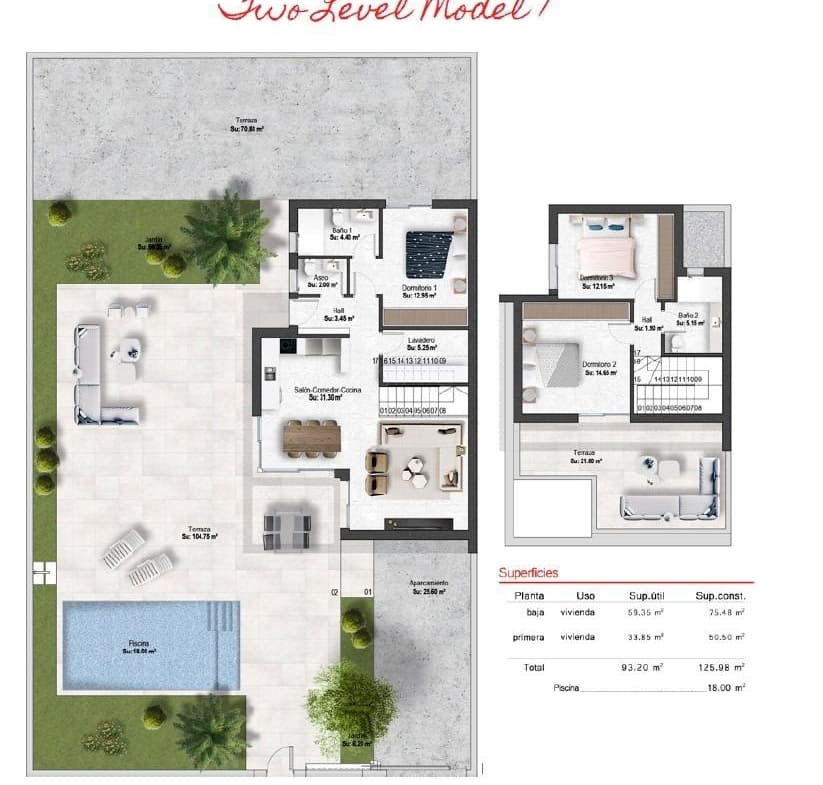 New Build Villas in Altaona Golf Resort Murcia with Private Pool and Mountain Views Contemporary Villas in Altaona Golf Resort Murcia Discover an exclusive new development of modern villas located in Altaona Golf Resort, one of the most attractive residential areas in Murcia. Surrounded by natural landscapes and mountains, this secure golf resort offers a peaceful environment while being just a short drive from the city of Murcia and the Mediterranean coast. These new build villas are designed to provide comfort, privacy and a relaxed Mediterranean lifestyle. The development offers a selection of villas on one level with optional solarium or two level layouts, all featuring three bedrooms and two bathrooms, including a master bedroom with en suite bathroom. Spacious Design with Private Gardens and Pool Each villa is built on a private plot starting from 300 m2, offering ample outdoor space to enjoy the sunshine all year round. The properties include a private swimming pool, landscaped garden areas and on plot parking. The interior layout is designed to maximize natural light and create a seamless connection between indoor and outdoor living. Open plan living and dining areas connect directly to the terrace and pool, creating the perfect setting for relaxing or entertaining family and friends. Quality Finishes and Modern Features These villas are built using high quality materials and modern construction techniques to ensure comfort and energy efficiency. Features include a reinforced security entrance door, fully fitted kitchen with appliances, underfloor heating in bathrooms and interior LED lighting package. Additional specifications include pre installation for ducted air conditioning and hot water production via an energy efficient aerothermal system, providing both sustainability and cost savings. Prime Location Close to Golf, City and Coast Altaona Golf Resort is known for its 18 hole golf course, peaceful surroundings and excellent security, making it ideal for both permanent living and holiday homes. The resort offers a unique combination of nature, sport and proximity to key destinations. Murcia city center is located just 15 km away, offering a wide range of shops, restaurants, cultural attractions and services. The beaches of the Mar Menor and the Mediterranean coast are approximately 20 km away, perfect for enjoying sunny days by the sea. Other key distances include Murcia Corvera Airport 15 km, Cartagena city 35 km and several golf courses within a short drive, making this an ideal location for golf lovers and international buyers. Ideal Investment and Mediterranean Lifestyle Opportunity These new build villas in Altaona Golf Resort offer an excellent opportunity to enjoy a high quality lifestyle in a natural and secure environment, with easy access to both the city and the coast. Contact us today for more information or to arrange a viewing and discover your new home in Murcia.