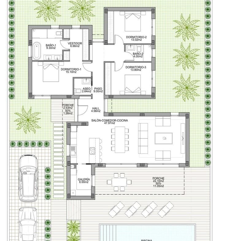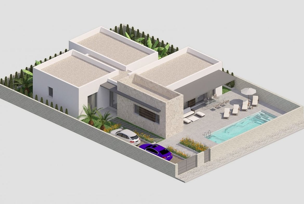 NEW BUILD MODERN VILLAS IN BENIJOFAR New Build villas located in Benijófar, a privileged area of the Costa Blanca, equipped with all services, 20 minutes from Alicante Airport, near the beautiful beaches of Guardamar and several golf courses. It is a modern style villas consisting of spacious living-dining room with an open-plan kitchen, 3 bedrooms( one of them en-suite) and 3 bathrooms. It also has a private plot with terrace, parking area, private pool, Mediterranean-style garden with great views. The house also has hot and cold air conditioning, video intercom and security door. Benijofar it is a lovely village with a charming church and all services such as supermarkets, pharmacies, banks, restaurants and natural park located very close to the villas. There are several golf courses close by as well as water parks in nearby Rojales and Torrevieja. Benijófar located a few minutes from the N-332 and AP-7. Just 30 minutes from Alicante airport, 10 minutes from the beaches of Guardamar and Torrevieja.