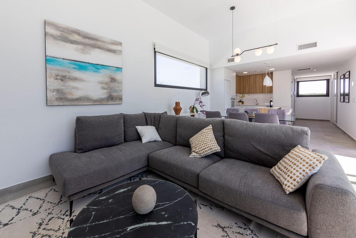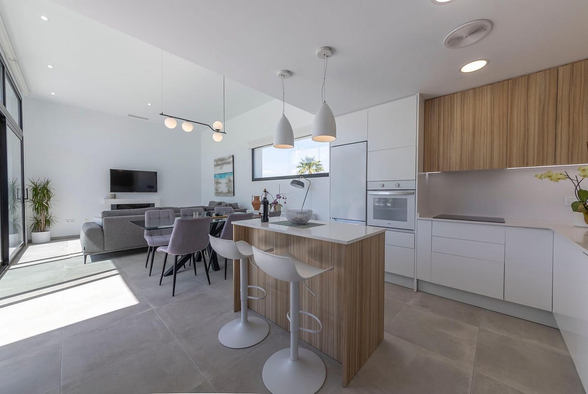 Matt black aluminum windows, motorized blinds, armored entrance door to the house, white lacquered interior doors, aerothermal system for hot water production, quartz (silestone) countertop in kitchen, electrical appliances included, pre-installation of air conditioning by ducts.
