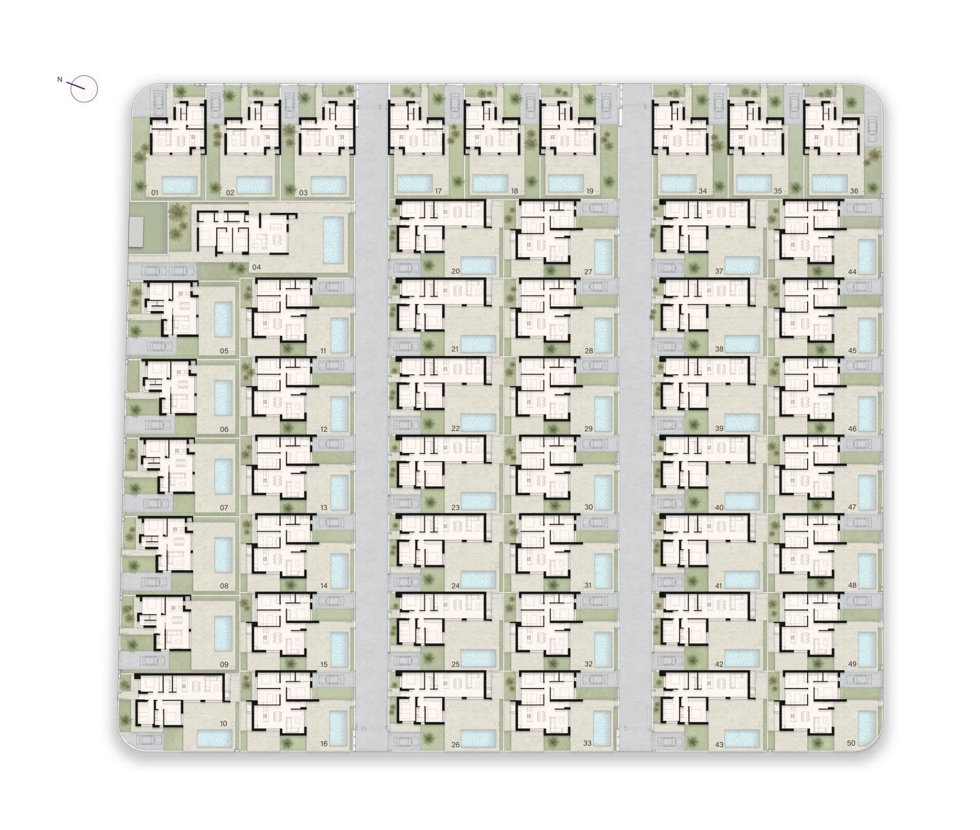 Villas: Independent properties with three bedrooms and 2/3 bathrooms, available in one- or two-story layouts. Each villa includes a private pool, a solarium, and parking within the plot. Optional basements are also available.