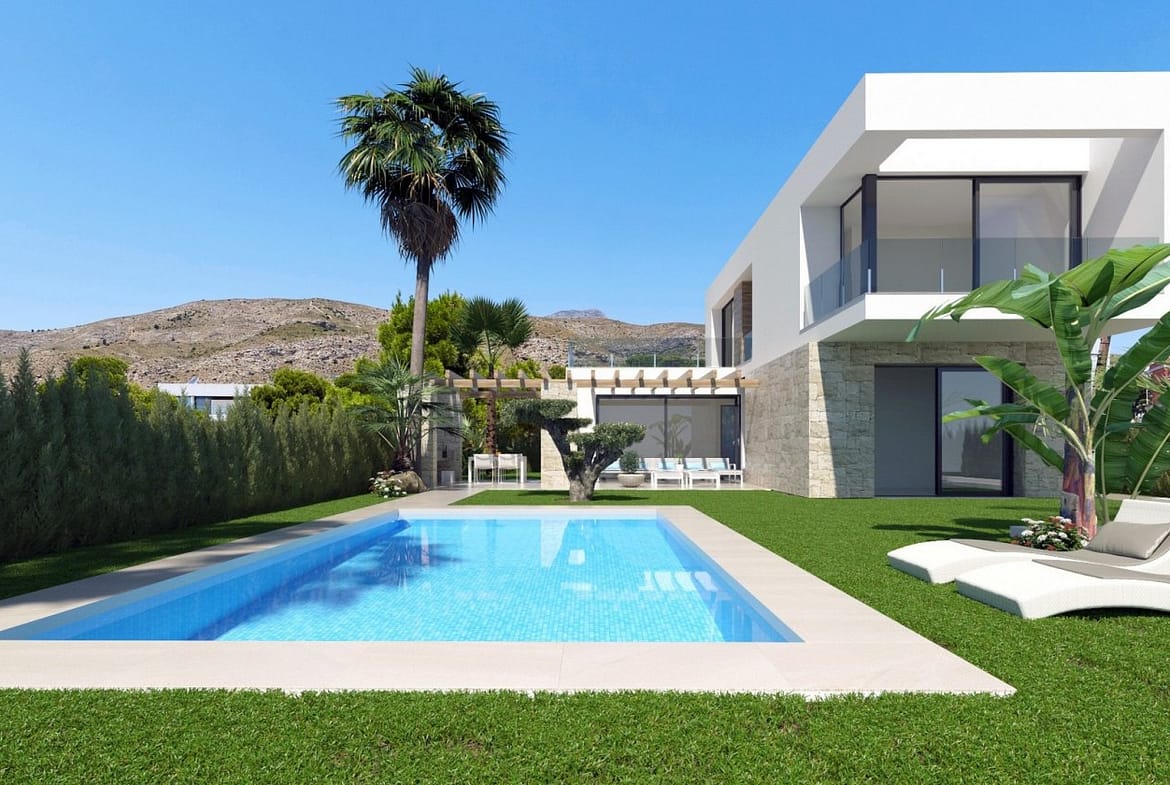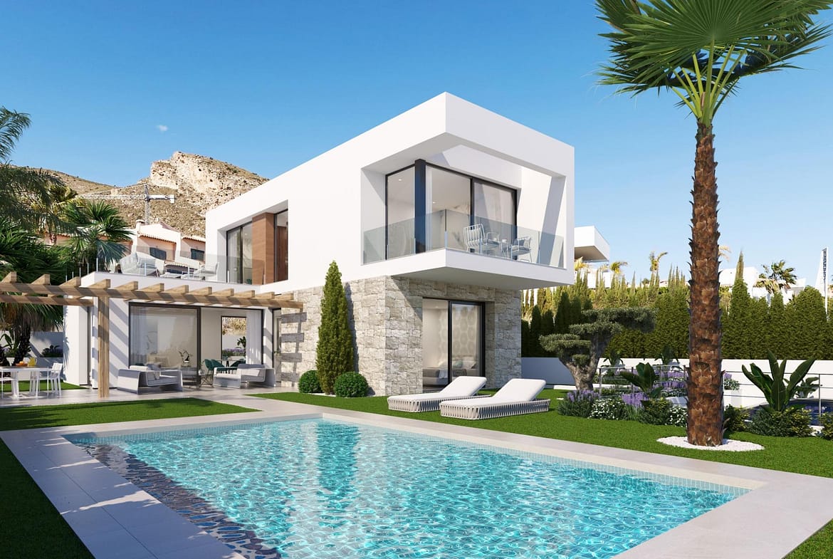 NEW BUILD VILLAS IN FINESTRAT New Build residential of modern villas located in Sierra Cortina, Finestrat. Modern style New Build villas with 3 bedrooms, 3 bathrooms, open plan kitchen, large living room with access to the terrace, private garden with the pool and parking space. Villas has a large terrace with sea and mountain views. Residential located 5 min by car from all the services that Benidorm can offer and in an environment with an average annual temperature of 20ºC and 300 days of sunshine a year, 44 km away from Alicante airport, 3 km from the sea and 200 meters to the golf.
