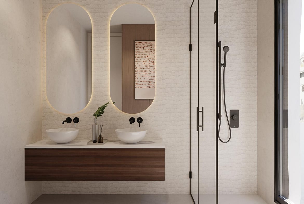 Fully equipped bathrooms with furniture, mirrors, and walk-in showers with screens