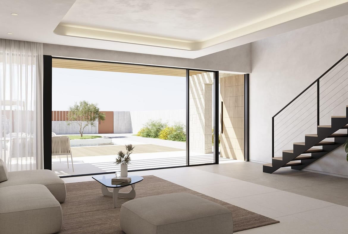 NEW BUILD VILLAS IN FINESTRAT New Build Modern villas in Finestrat. Villas with3 bedrooms and 3 bathrooms, open plan kitchen with lounge area, terrace with magnificent views over Benidorm, private garden with swimming pool and parking space. It is conceived as a fully walkable space with interior and exterior pathways that provide independent access to each floor. This design offers various perspectives of the architectural complex and its surroundings, with the sea and Sierra Cortina serving as a picturesque backdrop. The main entrance to the villa is located at the lower part of the plot, featuring ample parking for two vehicles. A water feature with lounge chairs introduces you to the ground floor, characterized by wide walls adorned with masonry. Extending seamlessly from the living room is a terrace, made possible by a large folding window. Wooden shutters on masonry walls provide a partially covered outdoor area for added comfort. The pool, with its aquamarine hues and gresite lining, sits adjacent to a pavement area crafted from non-slip porcelain tile with a wood-like appearance. This space also includes a barbecue area that can be customized to suit the user’s needs, with access from a paved zone through the natural terrain. Finestrat located in the Marina Baixa region of the Costa Blanca, close to neighbouring Benidorm and about 40 kilometres from the city of Alicante and the international airport. The village is situated on the mountainside of Puig Campana and offers beautiful views of the mountains, the coast and the Mediterranean Sea. Benidorm is just a five-minute drive from the properties and offers all the services you would need including shops, bars, restaurants, supermarkets, banks, pharmacies and several private international schools.