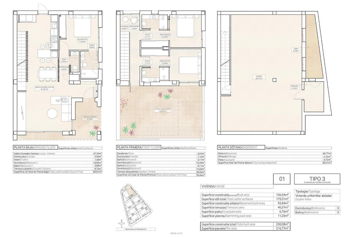 NEW BUILD VILLAS IN HONDON DE LAS NIEVES Modern New Build villas in Hondon de las Nieves. Villas composed over two floors and basement with English courtyard, has 3 bedrooms, 3 bathrooms, guest toilet, open plan kitchen with the lounge area, fitted wardrobes, terrace and private solarium. The spacious plots have a private garden with a swimming pool, a barbecue area, and the possibility to add a parking space. Hondón de las Nieves is a town in the Valencian Community, Spain. It is located in the southwest of the province of Alicante, in the region of Vinalopó Medio. The beaches and Alicante Airport are closely just 30 minutes drive away.