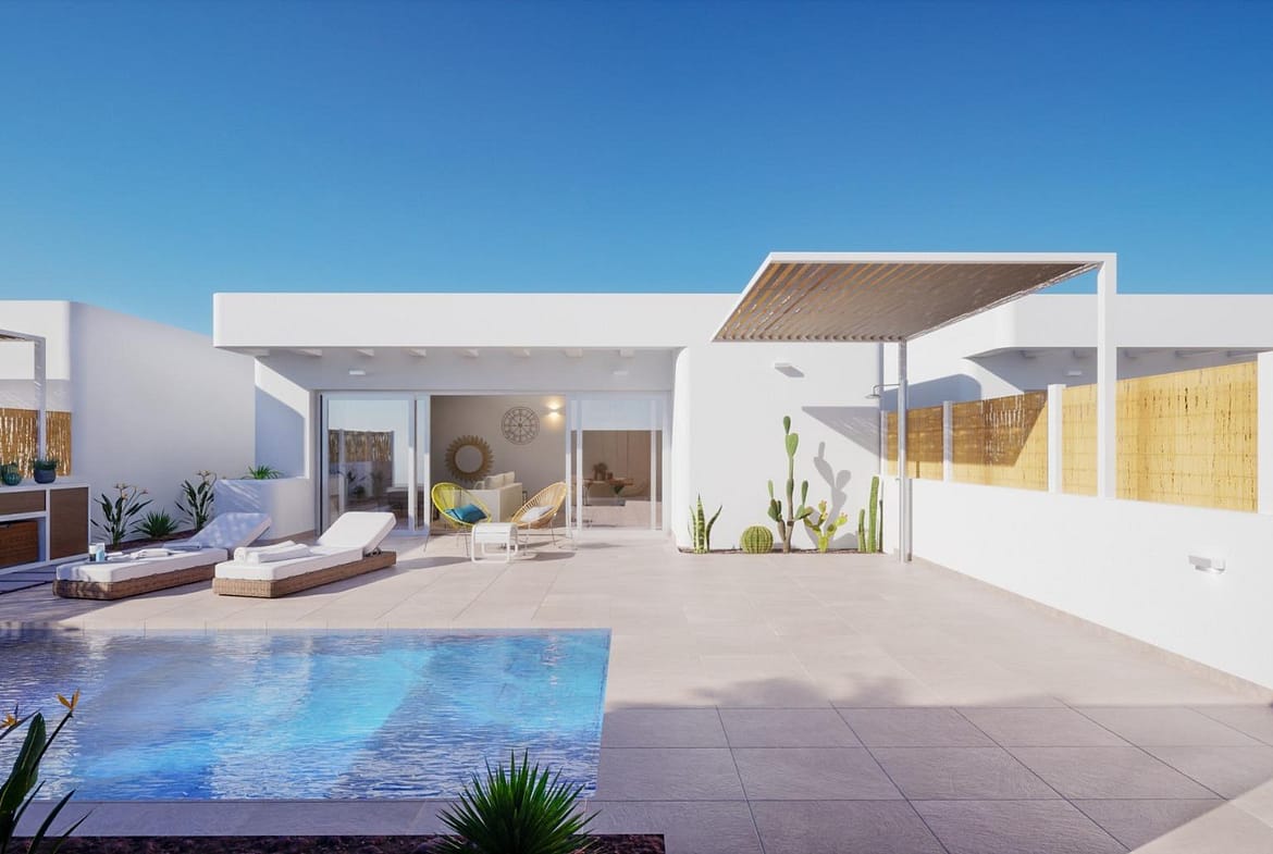 NEW BUILD VILLAS IN LOS ALCAZARES New Build villas in Los Alcazares . Ibiza style New Build villas on an independent plots with terrace, parking area and private pool. The house has a living room, kitchen, 3 bedrooms, 2 bathrooms, and has privileged views. An options for a private solarium at an extra cost. Carefully designed housing with high quality materials to satisfy the most demanding clients. Villas located 1 km from the beach and the town of Los Alcázares, where you can practice various water sports, surrounded by several golf courses. City of Cartagena less than 15 minutes by car and 30 minutes from Murcia Corvera airport.