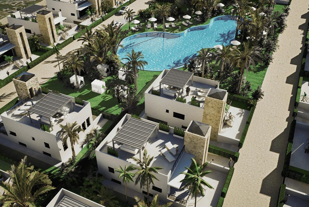 New Build Villas in Camposol Golf (Mazarron-Murcia) with Private Solarium and Basement Exclusive Residential Villas at Camposol Golf Discover this private residential complex of 69 independent villas located in a plot frontline to Camposol Golf in Mazarron, Murcia. Designed around a large central green oasis with a communal swimming pool and landscaped gardens, this development offers a peaceful and secure environment ideal for enjoying the Mediterranean lifestyle. The location combines tranquility with convenience, as the nearby village of El Saladillo provides daily services, shops and local amenities within a short distance. The beautiful beaches of Puerto de Mazarron are just 14 km away, making this an excellent option for both permanent living and holiday homes. Modern Single Level Villas with Flexible Layouts The development offers a selection of modern villas built on one level, available in two or three bedroom configurations. All homes include two bathrooms, one of them en suite, designed with functionality and comfort in mind. Each villa is set on a private plot starting from 300 m2, providing outdoor space for relaxation and entertainment. The properties also feature a private solarium, offering additional outdoor living space with open views of the surrounding golf course and landscape. Basement and Customization Potential A key feature of these villas is the inclusion of a spacious basement, allowing owners to customize the space according to their needs. This area can be adapted into a gym, storage room, home cinema or additional living space, offering great flexibility and added value. The villas are designed with interior stairs connecting all levels, ensuring easy access between the basement, main living area and rooftop solarium. Quality Features and Comfortable Living These new build homes are delivered with high quality finishes and modern features. The kitchens come fully furnished and equipped with appliances, while the bathrooms are completed with shower screens and fittings. Additional features include pre installation for air conditioning, built in wardrobes, electric shutters and a full LED lighting package, ensuring comfort and convenience from day one. Prime Location in Mazarron Near Golf and Coast Camposol is a well established residential area known for its golf course, relaxed atmosphere and international community. Mazarron offers a wide range of services, restaurants and leisure options, while the nearby coast is famous for its sandy beaches and crystal clear waters. Key distances include Camposol Golf on your doorstep, El Saladillo village 2 km, Puerto de Mazarron beaches 14 km, Mazarron town center 10 km, Murcia Corvera Airport 35 km and Cartagena city 40 km. Ideal Investment and Lifestyle Opportunity in Murcia This development offers an excellent opportunity to own a modern villa in a golf front location with great potential for customization and strong rental appeal. Contact us today to receive more information or to arrange a viewing and secure your new villa in Camposol-Mazarron.