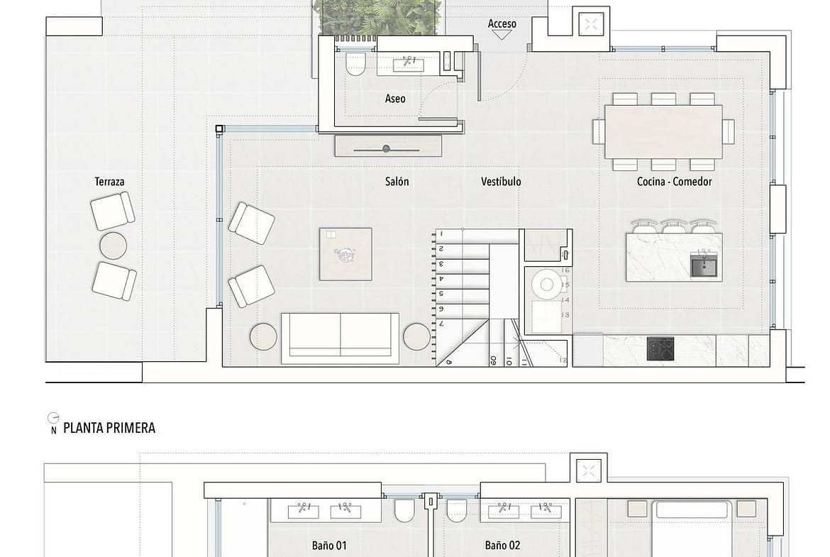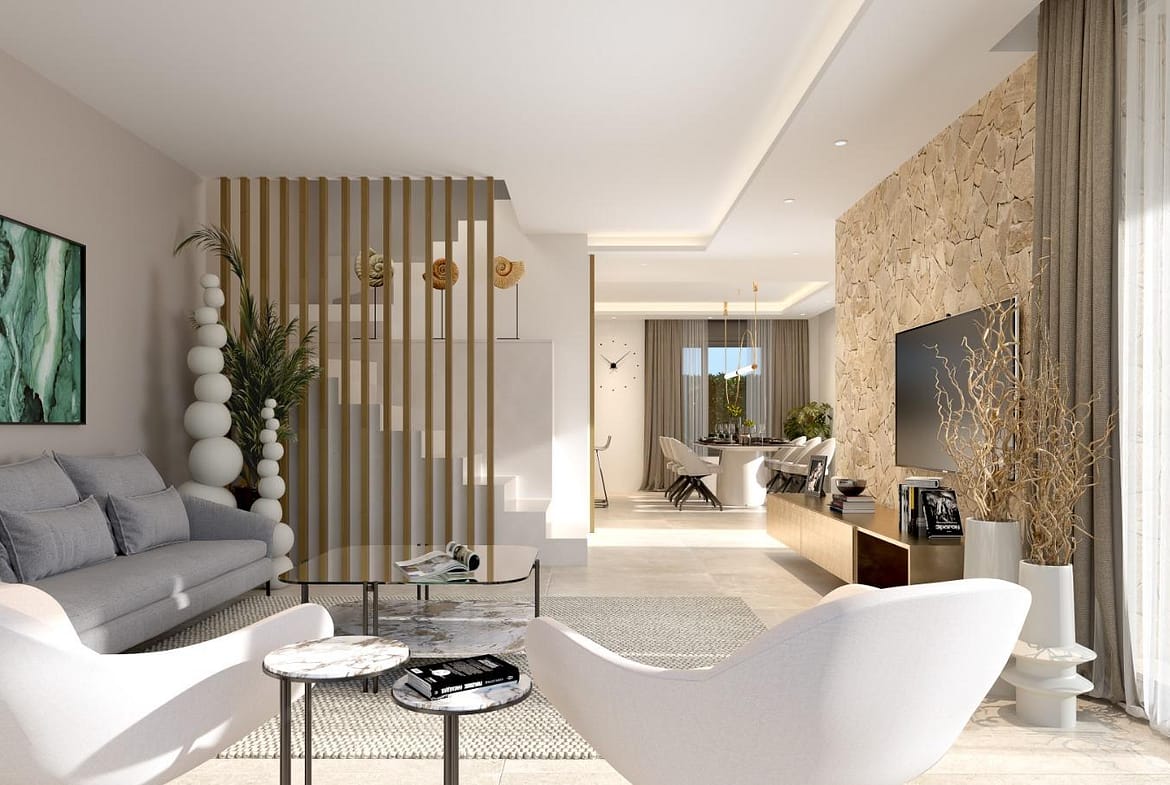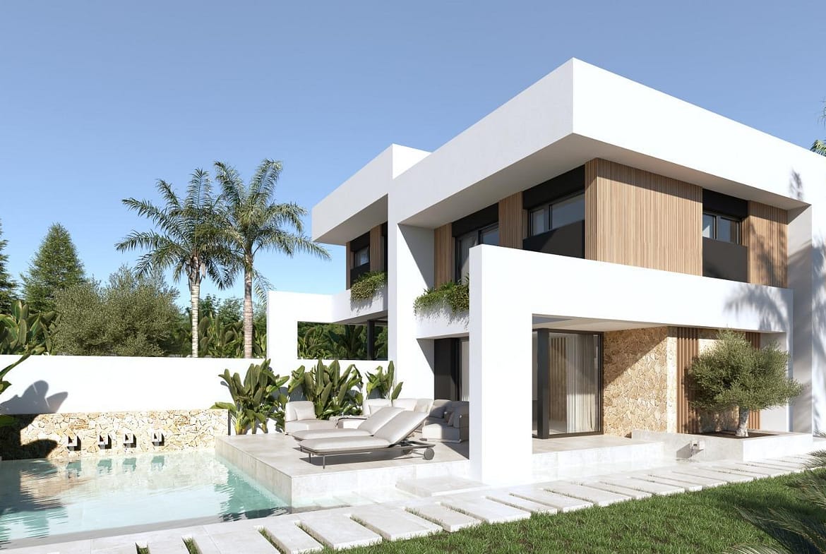 Modern Semi Detached Villas with Private Pool in Las Filipinas-Orihuela Costa Exclusive New Build Villas in a Prime Costa Blanca Location Discover this boutique development of eight modern semi detached villas located in Las Filipinas, Orihuela Costa, one of the most sought after residential areas in the southern Costa Blanca. This well established neighborhood offers excellent access to everyday amenities including supermarkets, restaurants, pharmacies and leisure facilities, all within a short distance. Ideally positioned between some of the best golf courses in the area, including Villamartin Golf, Campoamor Golf, Las Ramblas Golf and Las Colinas Golf, these villas provide an exceptional lifestyle for golf lovers and international buyers. The beautiful beaches of Orihuela Costa are just 6 km away, making this an ideal location for both permanent living and holiday homes. Contemporary Design with Spacious Layouts Each villa is built on a private plot of approximately 300 m2 and offers around 140 m2 of modern living space distributed over two floors. The properties feature three double bedrooms, two full bathrooms with double sinks including an en suite, and an additional guest toilet. The ground floor showcases a bright and stylish living area with a feature wall finished in natural stone, creating a warm and elegant atmosphere. Large windows provide direct access to the outdoor terrace and private swimming pool, which includes decorative water features. At the rear of the property, a designer Italian kitchen with a central island and LED lighting opens to a spacious dining area with access to the garden and private parking area. Elegant Bedrooms and Outdoor Living The first floor includes two guest bedrooms with built in wardrobes and a family bathroom. The master bedroom stands out with a sophisticated design, featuring a floor to ceiling oak headboard, mirrored details and a luxurious en suite bathroom, as well as views over the pool area. There is also the option to add a rooftop solarium or a semi basement, offering additional space and customization potential. High Quality Features and Modern Comfort These villas are built with high quality materials and the latest technology to ensure comfort and efficiency. Features include pre installation for ducted air conditioning, aerothermal system for hot water, underfloor heating in bathrooms and electric shutters. Additional specifications include an alarm system, video intercom and automated vehicle access gate, ensuring both convenience and security. Prime Location Close to Beaches and Golf Las Filipinas offers a strategic location with excellent connectivity. The beaches of Orihuela Costa are approximately 6 km away, while Murcia International Airport is 50 km and Alicante Airport is 55 km. Several top golf courses are located within a radius of 2 to 5 km. Ideal Investment Opportunity on the Costa Blanca These modern villas offer a perfect combination of design, location and lifestyle, making them an excellent investment or second home on the Costa Blanca. Contact us today for more information or to arrange a viewing and secure your new villa in Orihuela Costa.