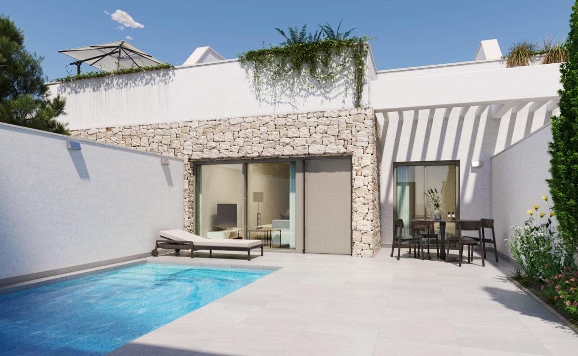 NEW BUILD SEMI-DETACHED VILLAS IN PILAR DE LA HORADADA New Build semi-detached villas located in Pilar de la Horadada. Villas build on 1 floor and has private solarium, 3 bedrooms, 2 bathrooms, open plan kitchen with the living room, garden with parking space. An options for a private pool at an extra cost. Properties located a few meters from all services and the centre. Pilar de la Horadada is a typical Spanish village in the most southern part of the Costa Blanca. The large main street has supermarkets, lots of shops, restaurants and bars and some lovely squares. The beautiful beaches of Torre de la Horadada and Mil Palmeras with fine sand promenade is just 5 minutes away. In Pilar de la Horadada there is also a well-developed cycling and walking path network, and there is also a large offer of various sports activities. Lo Romero 18 hole golf course is just a short drive from town. The airports of Corvera (Murcia) and Alicante are respectively 40 and 55 minutes away.