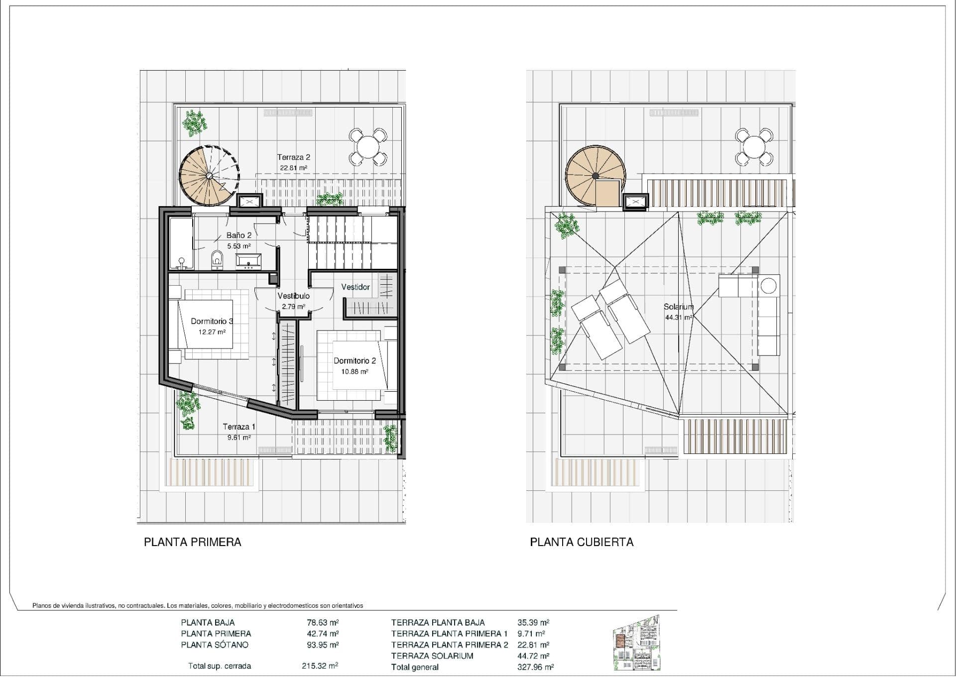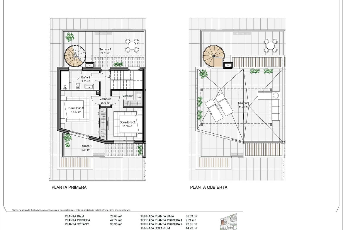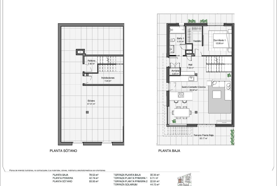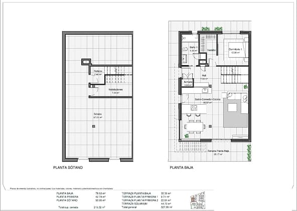 Modern properties with 3 spacious bedrooms with built-in wardrobes (the main one on the ground floor, with bathroom and dressing room en suite), 2 spacious bathrooms, large living-dining room with open kitchen, spacious terraces.