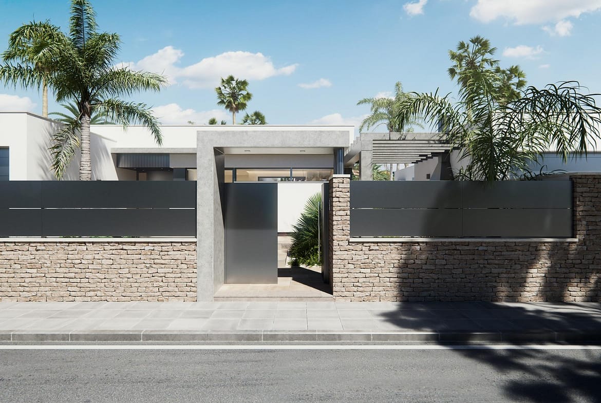 NEW BUILT VILLA ON A FLOOR Three exclusive villas in a residential area in San Javier with 600 m2 of plot and 217 m2 of built area on one floor, private pool and large garden areas. Residential with an architectural design based on clear, cubic and functional lines in an exclusive residential enclave in San Javier (Murcia). Automated garden and garage access doors with infrared remote control. Large covered garage for two vehicles with separate entrance. Gardens with a water drainage system on the floor, completely finished and customizable including vegetation, irrigation and lighting.