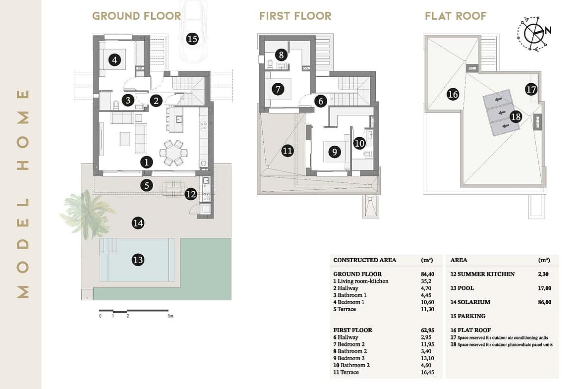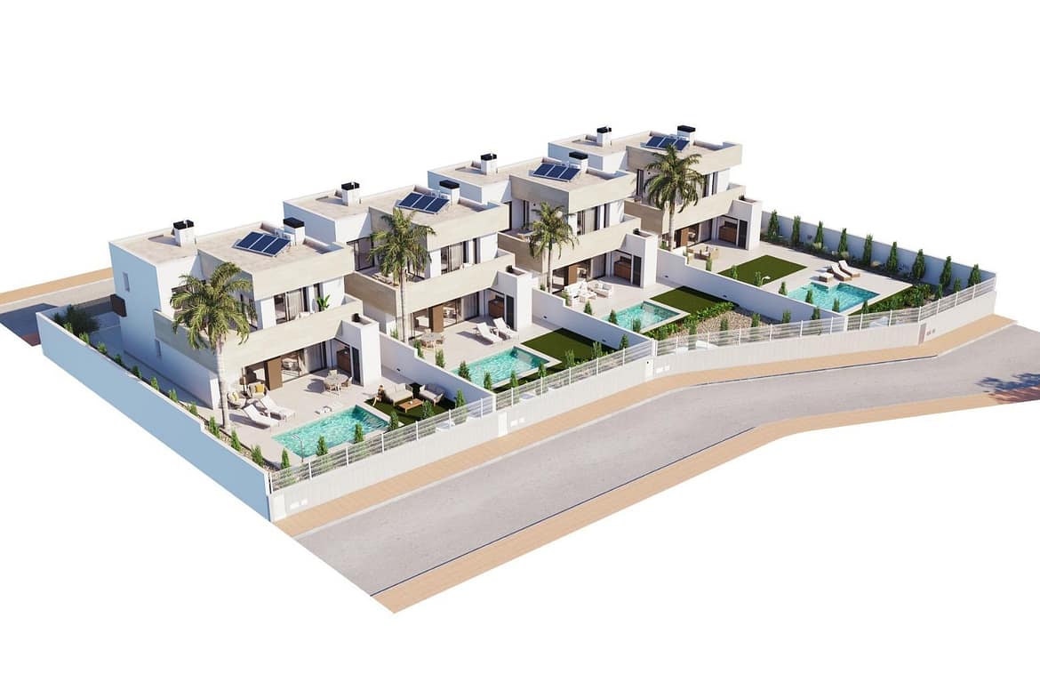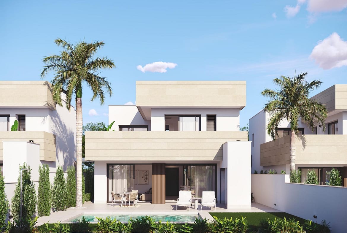 Modern New Build Villas Near the Beach in Santiago de la Ribera Contemporary coastal living in the Costa Cálida Discover an exclusive development of independent villas in Santiago de la Ribera, located just 750 m from the beautiful shores of the Mar Menor. This charming coastal town in the Murcia region is known for its relaxed Mediterranean lifestyle, clean sandy beaches, and year round sunshine. Here, you can enjoy the perfect blend of privacy, comfort and proximity to all essential amenities, leisure options and outdoor activities. Whether as a permanent residence, a holiday home or an investment with strong rental potential, these villas offer a superb opportunity to embrace coastal living in one of the most desirable areas of the Costa Cálida. Elegant design and functional layout Designed with a modern architectural style and high functionality, each villa is distributed across two floors to maximize space and natural light. The homes include 3 spacious bedrooms, including one on the ground floor 3 fully equipped bathrooms, all ensuite Private garden and swimming pool First floor terrace ideal for sunbathing and relaxation Private parking with motorized gate This smart layout ensures comfort and privacy while providing generous outdoor spaces for entertaining, dining or simply enjoying the Mediterranean climate. High quality finishes and premium features These properties have been built to high standards with top quality finishes and modern installations, including Reinforced security entrance door Motorized shutters Fully furnished kitchen with appliances included Bathrooms with furniture, mirrors and underfloor heating Pre installation for ducted air conditioning Private swimming pool Two photovoltaic solar panels with micro inverter Designed for year round use, these homes ensure efficiency, comfort and style in every corner. Excellent location close to the sea and services Situated in a quiet residential area, yet surrounded by services, this development offers unbeatable convenience with quick access to beaches, marinas, shops and golf courses. Distances include Mar Menor beaches 0.75 km La Ribera Shopping Centre 2 km Roda Golf 5 km Lo Pagán Marina 4 km Dos Mares Shopping Centre 3 km San Javier Airport 6 km Murcia 40 km Cartagena 30 km The area is perfect for nature lovers, water sports enthusiasts and anyone seeking a vibrant yet peaceful lifestyle by the sea. Make your Mediterranean dream a reality Do not miss the chance to own a stylish new build villa in one of the most sought after coastal towns in Murcia. Contact us today for more information or to book a viewing.