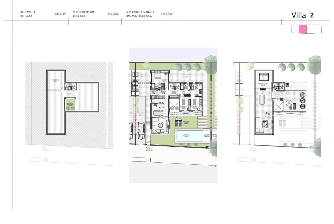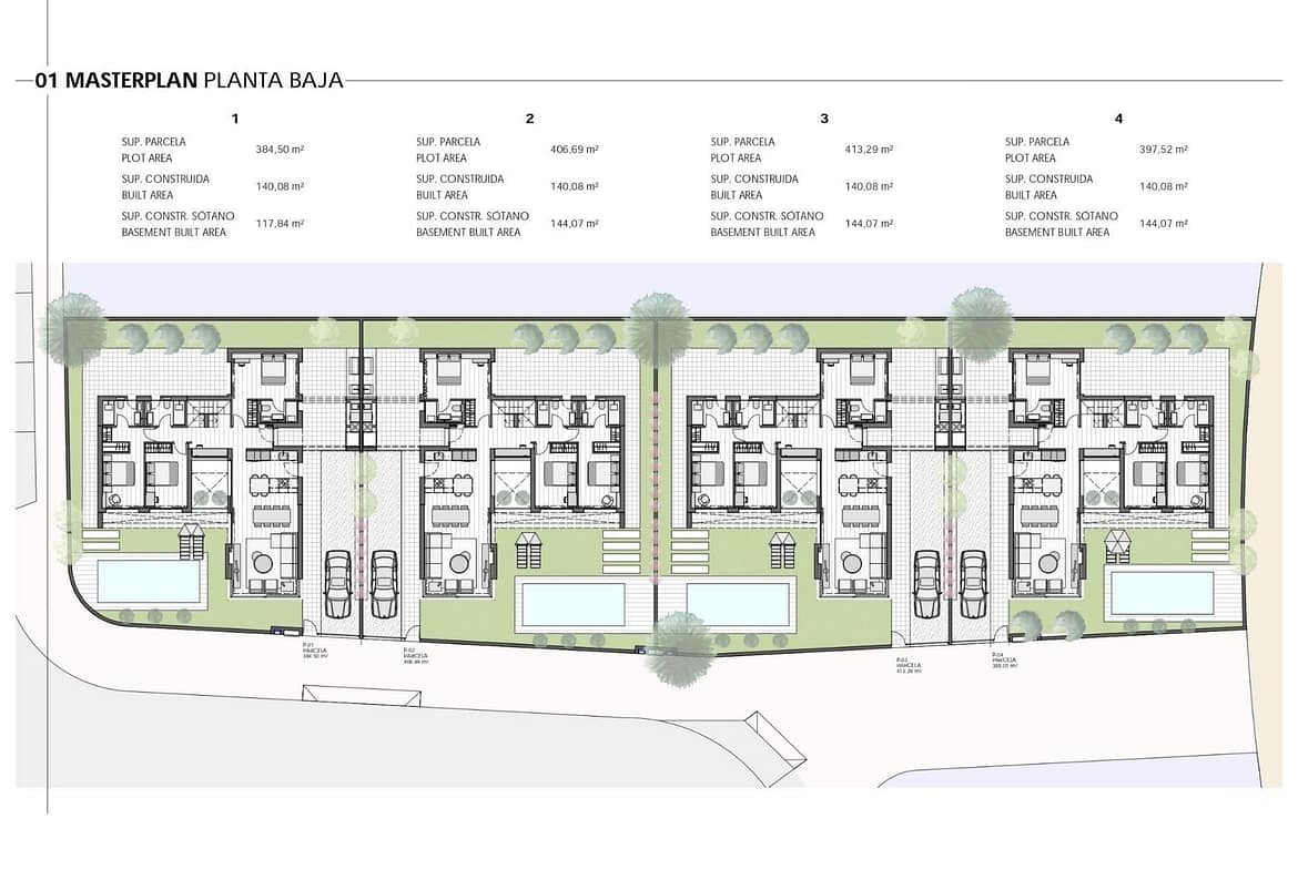 This exclusive project consists of 4 independent villas with 3 bedrooms and 3 bathrooms on one floor, with private swimming pool 3 x 7, open plan basement with light and ventilation through an English patio and large solarium on a plot of 400 m2 approx. The properties have fully equipped kitchens and bathrooms and pre-installation of air conditioning ducts.
