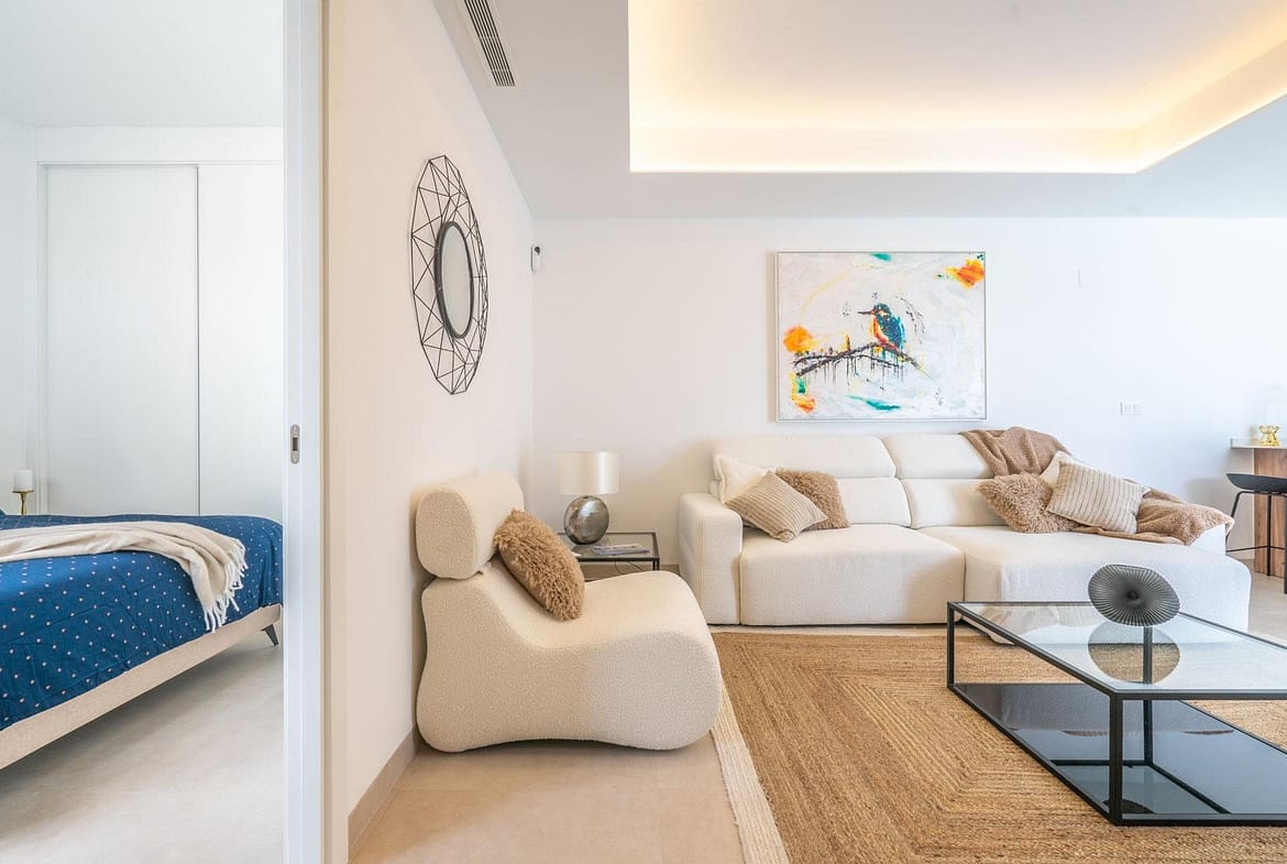 The master bedroom includes an en-suite bathroom, while two additional bedrooms share a family bathroom, all designed with a contemporary touch and high-quality finishes.