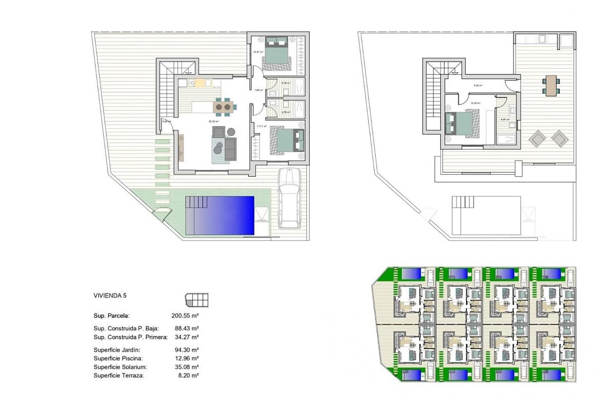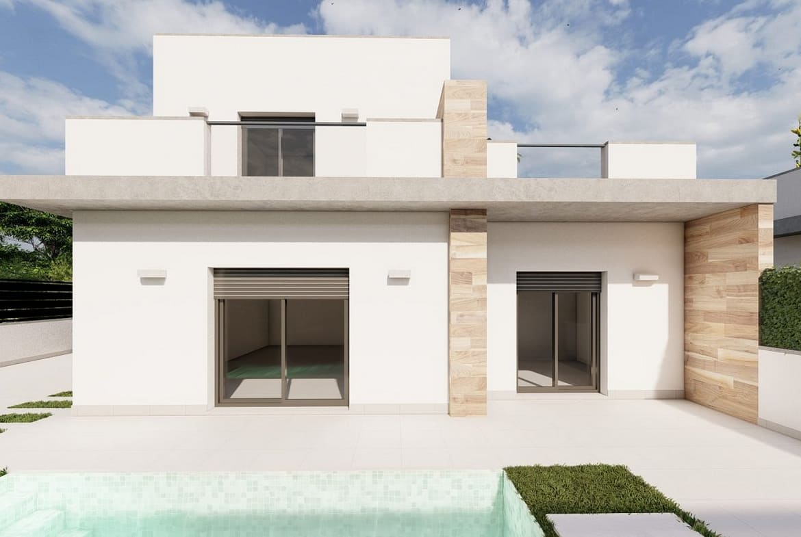 NEW BUILD SEMI-DETACHED VILLAS IN ROLDAN New Build luxury complex of one or two levels semi-detached villas in Roldan. You have an option of semi-datached villas with 2 bedrooms, 2 bathrooms build over one floor with solarium or with 3 bedrooms, 3 bathrooms build over two floors with lalrge terrace. On the top floor, on the terrace or solarium you will have a summer kitchen that allows you to enjoy all hours of sunshine, every day of the year. All villas has private garden with with pool and parking space. Designed with a contemporary style and open planned concept, comprising a fully-fitted kitchen and lounge-dining room. The development is located in Roldán (Murcia), within a gated and security control resort. Is near the beach, surrounded by services, parks, sports facilities and several Golf Courses. The property will meet the highest standards and will be equipped with: Private swimming pool preinstalled for heating system and with solar shower. Kitchen completely furnished and equipped with oven, microwave, fridge, integrated dishwasher and extractor fan. Also, central wooden island. Lighting: LED inside the property as well as in outdoor areas. Lined wardrobes with drawers. Fully fitted bathrooms with suspended toilet, shower screens, vanity unit, mirror with light and rainfall shower. Summer kitchen in solarium. Pre-installation for ducted air conditioning. Parking space on the plot. Roldan itself is a traditional town with all the local amenities you will need including Supermarkets, Restaurants, Bars, Health Clinic, Pharmacy, Police Station, Petrol Station, Mechanics, Dentists, Doctors and more. The nearby golf resorts of La Torre, & Terrazas are easily accessible, Corvera Airport is 15 minutes away & the beaches of the Mar Menor just 20 minutes drive.